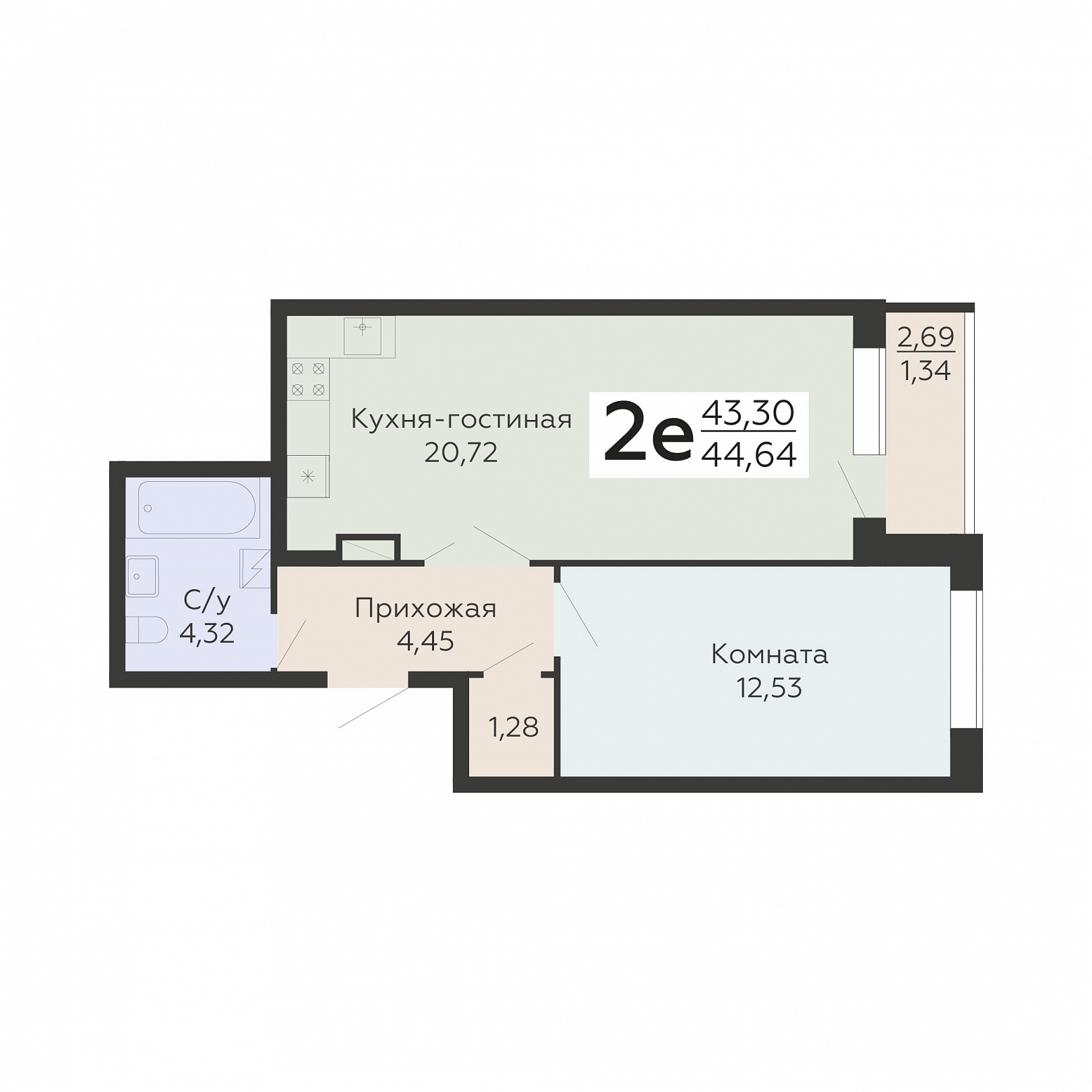 2-ком. квартира (Евро), 44.64 м2, 2 этаж, №289, Никитинские сады