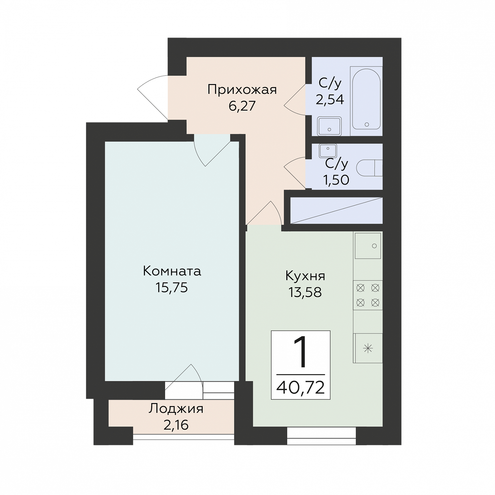 1-комнатная квартира, 40.72 м2, 20 этаж, №310, Юность