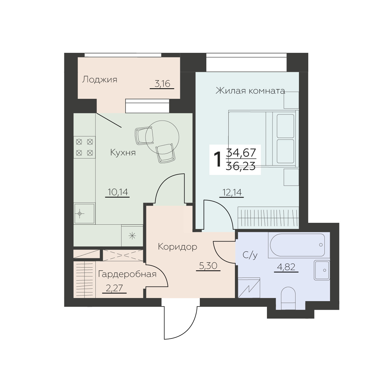 1-комнатная квартира, 36.23 м2, 5 этаж, №596, Заря