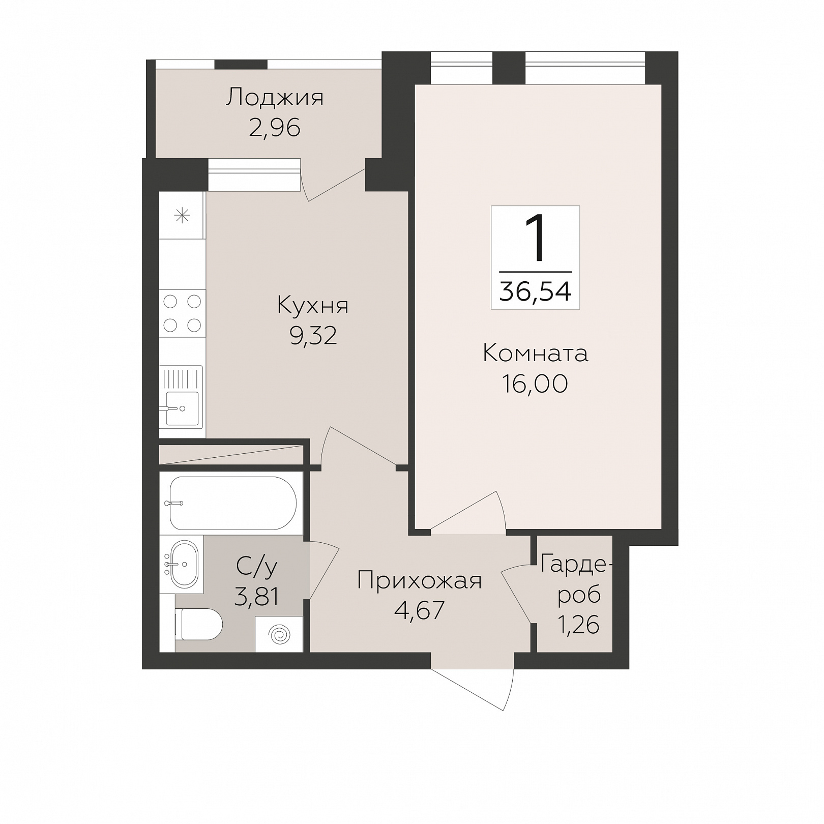 1-комнатная квартира, 36.54 м2, 9 этаж, №95, Квартал 45
