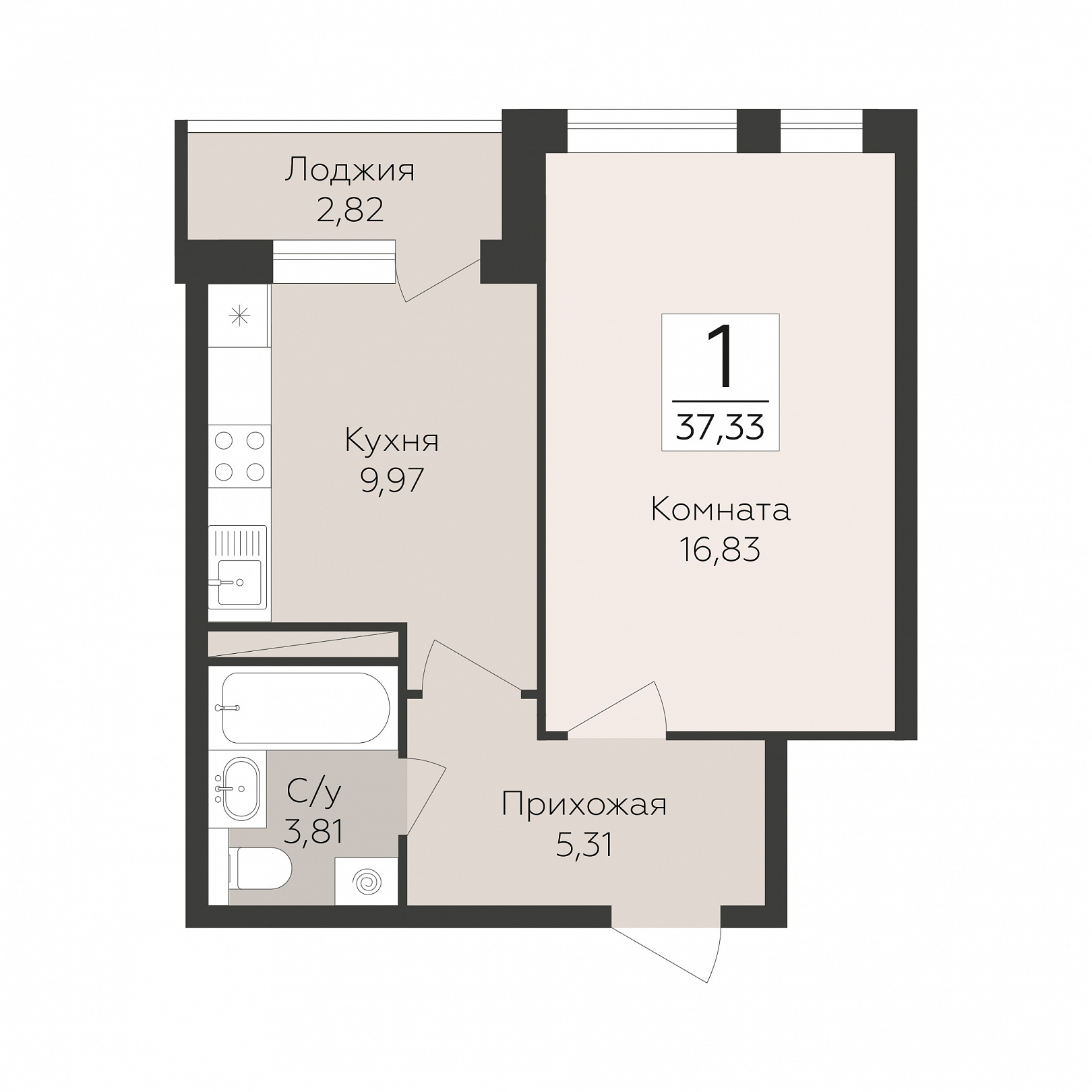 1-комнатная квартира, 37.33 м2, 9 этаж, №97, Квартал 45