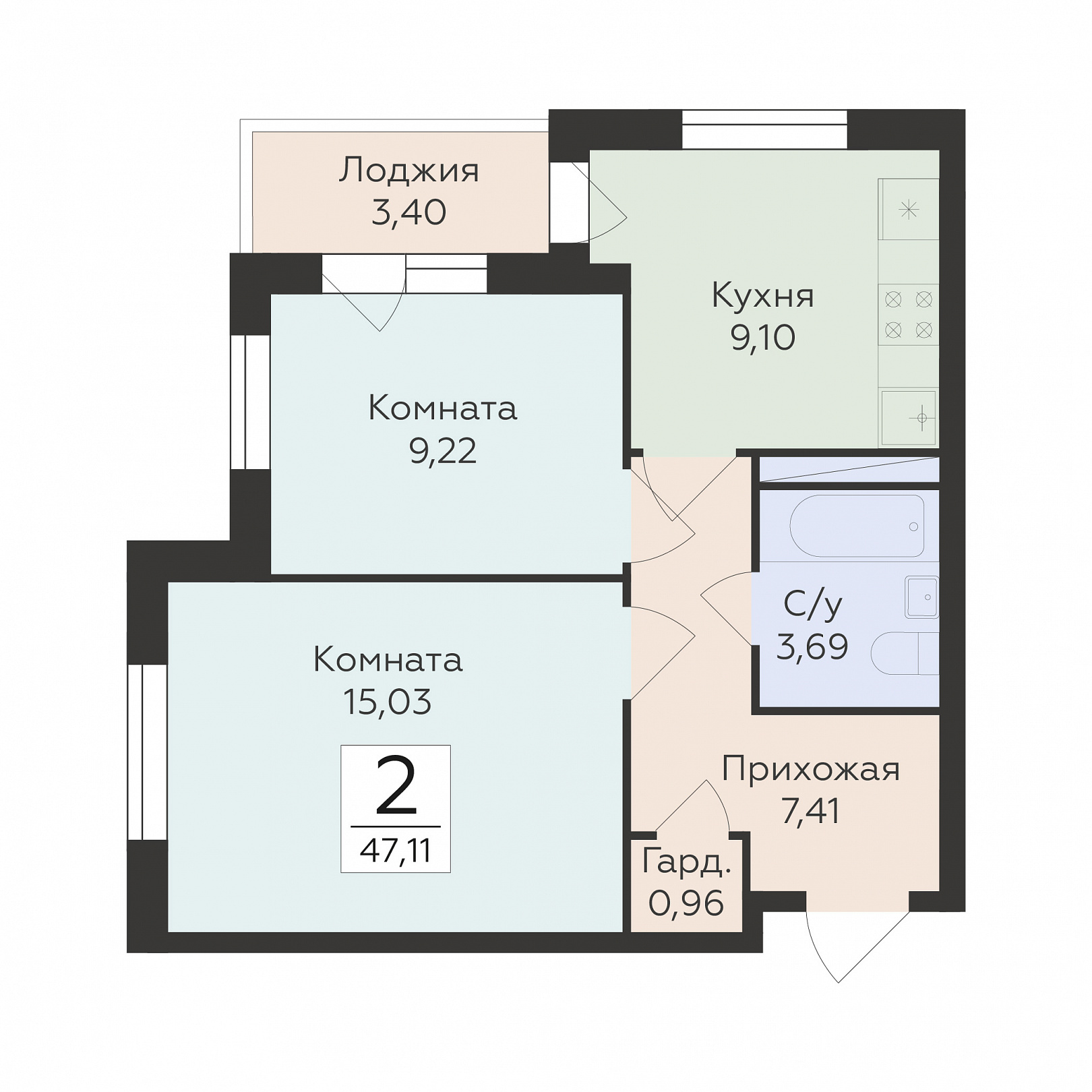 2-комнатная квартира, 47.11 м2, 12 этаж, №141, Авиапарк