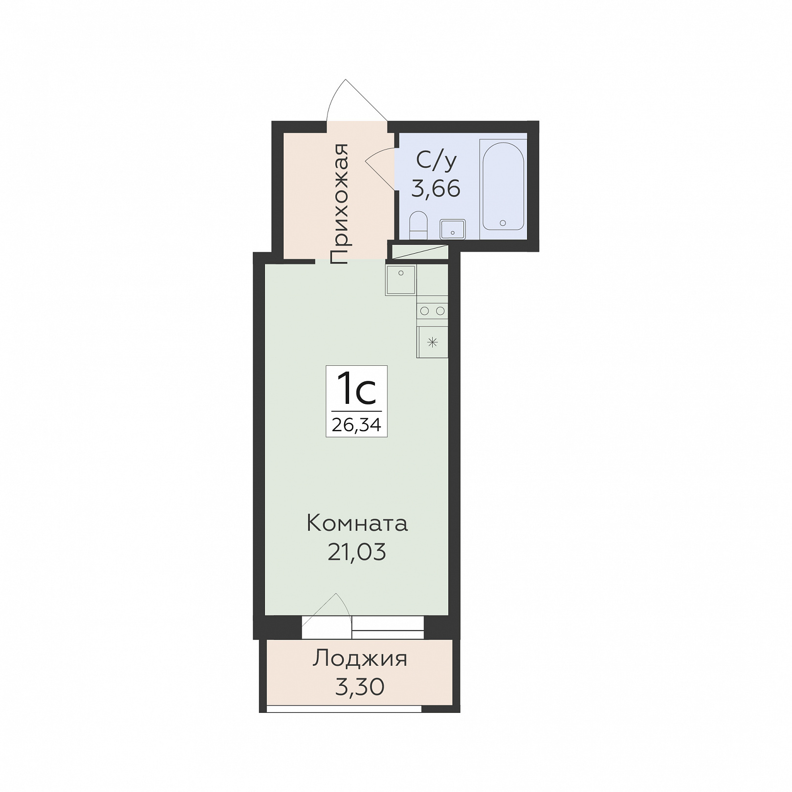 1-комнатная (студия), 26.34 м2, 13 этаж, №350, Авиапарк