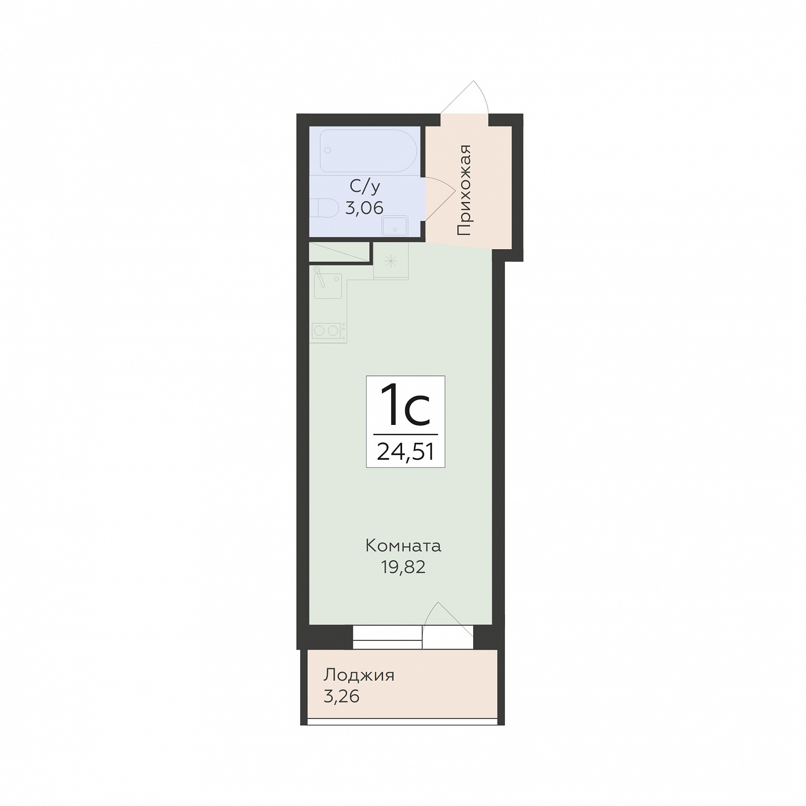 1-комнатная (студия), 24.51 м2, 13 этаж, №245, Авиапарк
