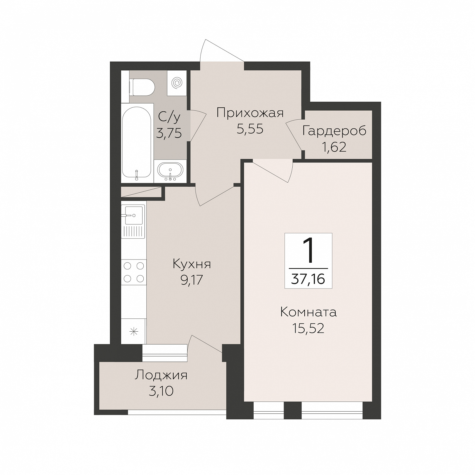 1-комнатная квартира, 37.16 м2, 11 этаж, №275, Квартал 45