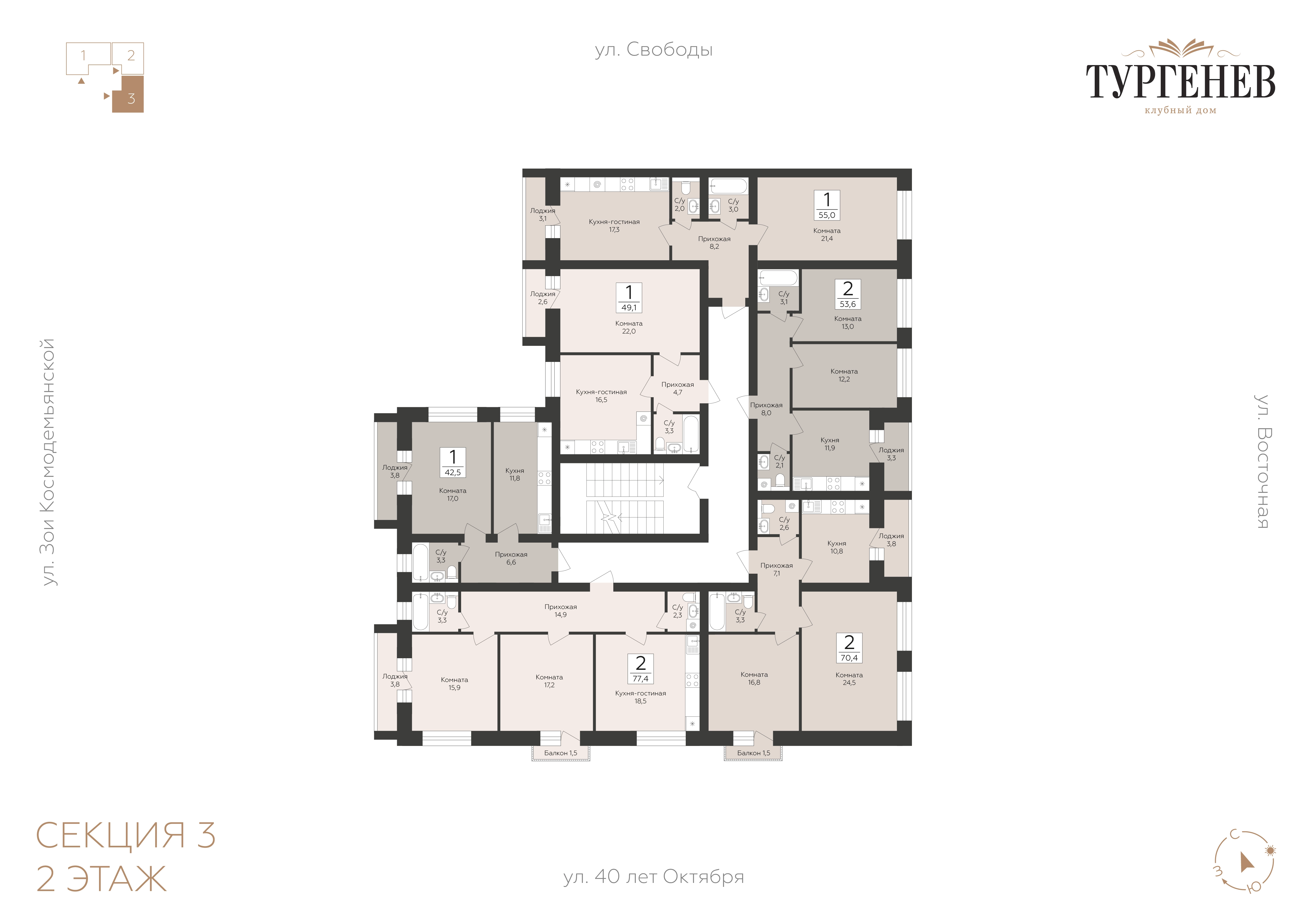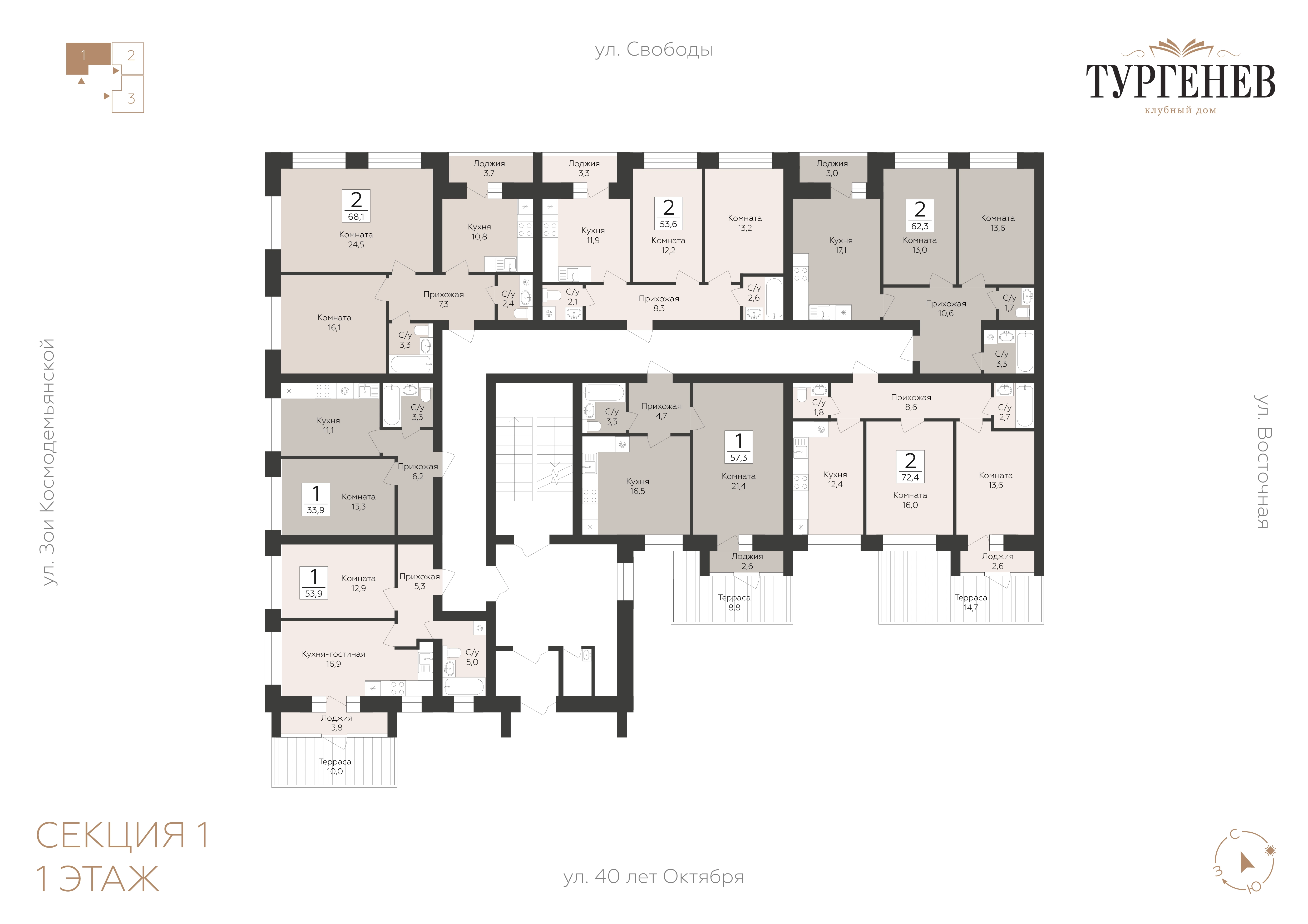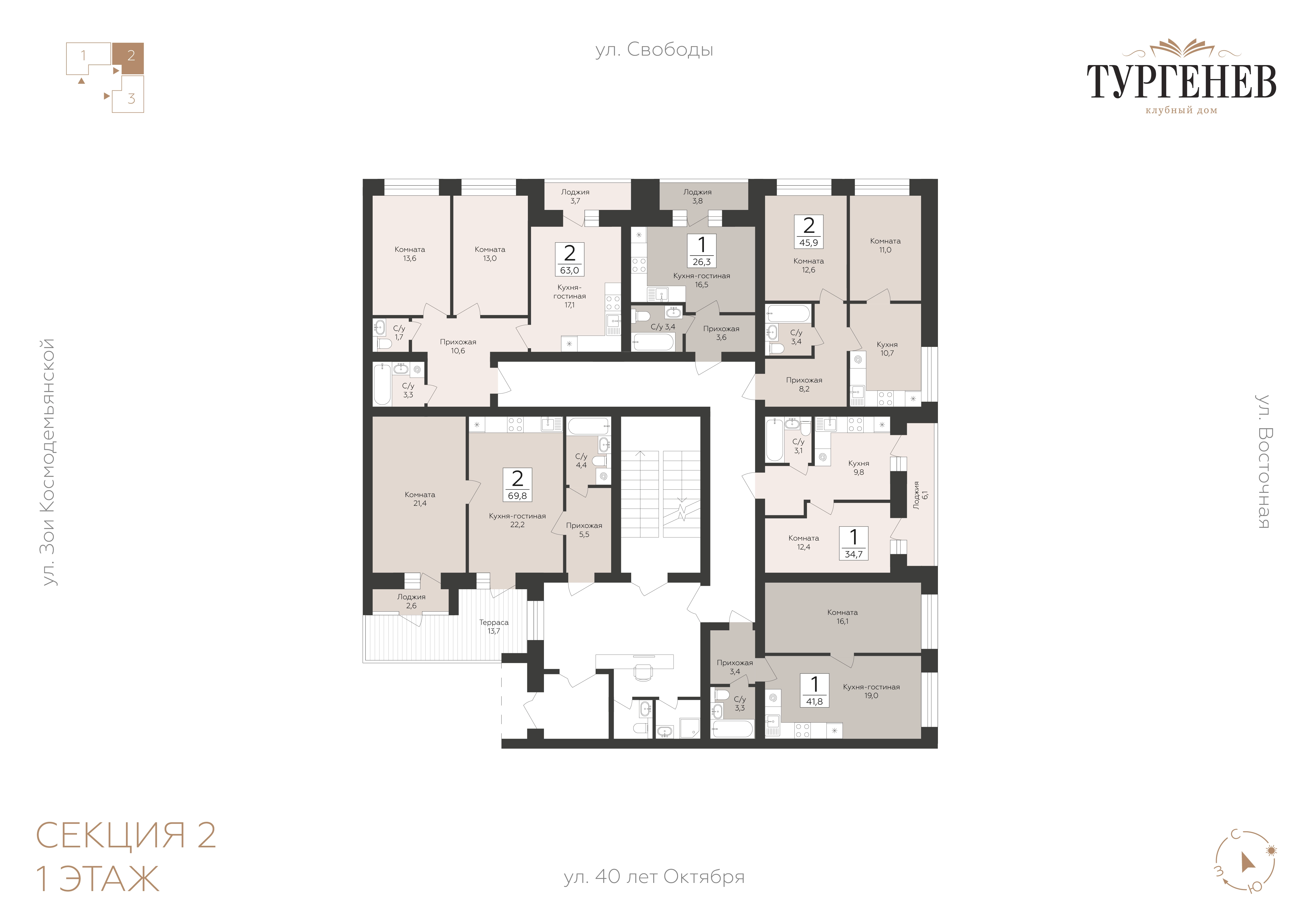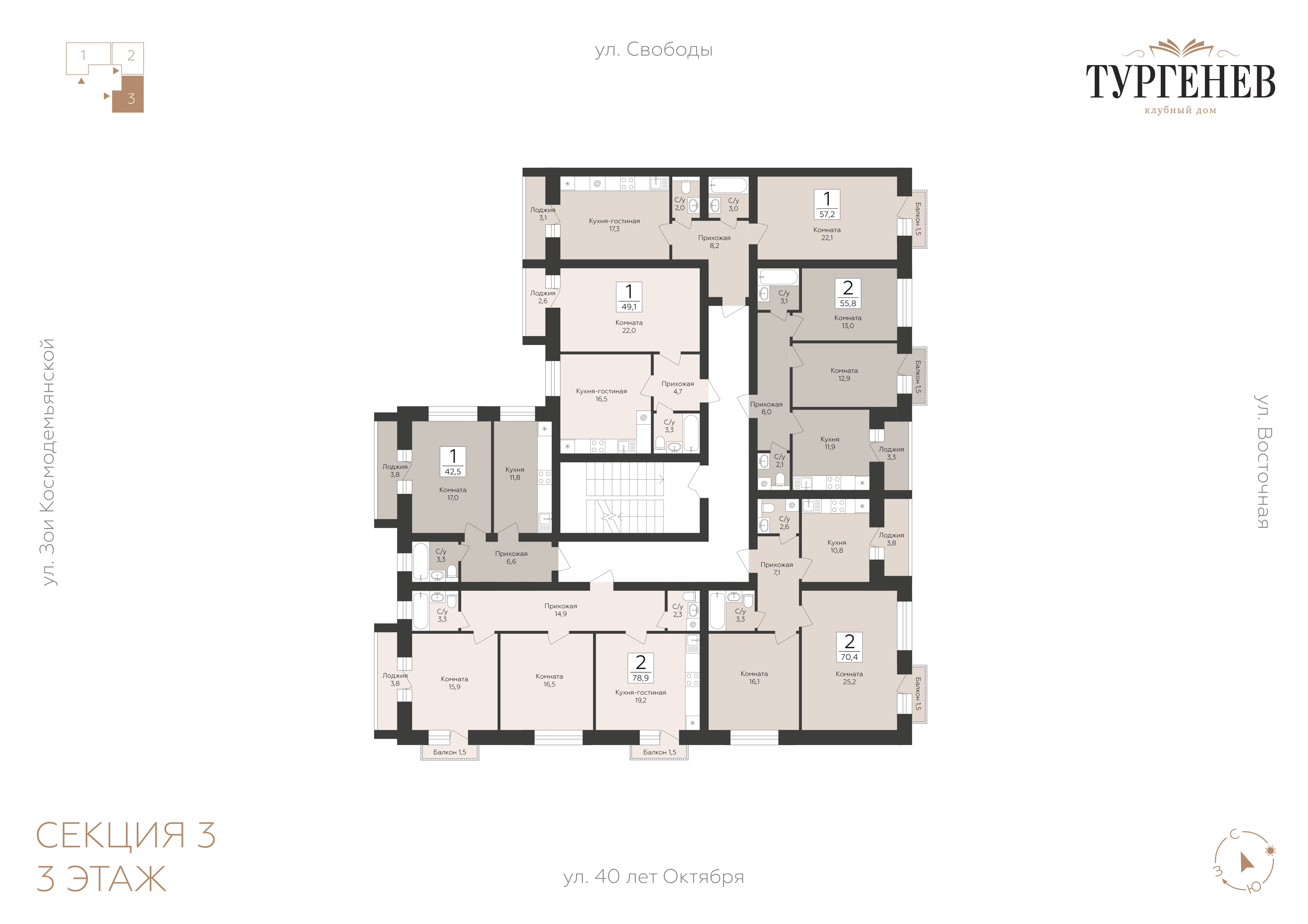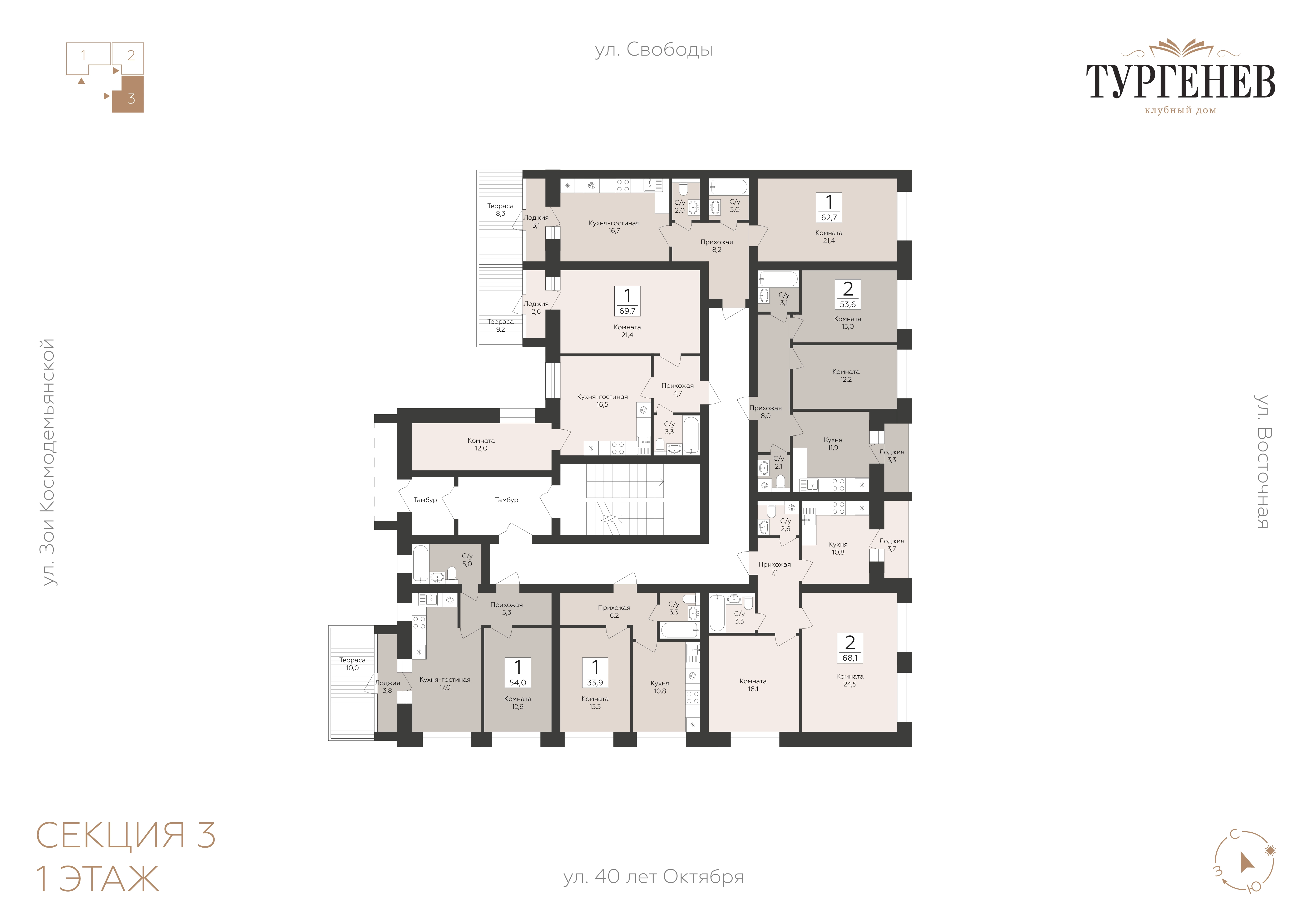 ЖК Тургенев – это уютный клубный дом, состоящий из трёх четырёхэтажных секций. Проект гармонично интегрирован в зелёные парковые зоны и обладает собственным закрытым двором без машин, создавая атмосферу приватности и спокойствия. Архитектура выполнена в современном стиле с акцентом на лаконичные кирпичные фасады и выразительное панорамное остекление, которое наполняет пространство светом и связывает интерьер с окружающим ландшафтом