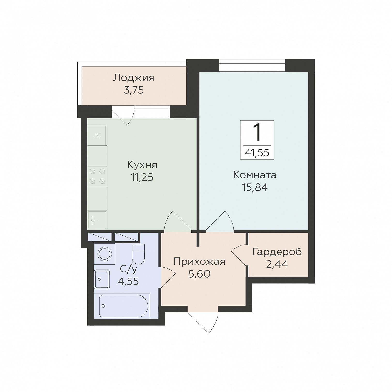 1-комнатная квартира, 41.55 м2, 2 этаж, №190, Романовский