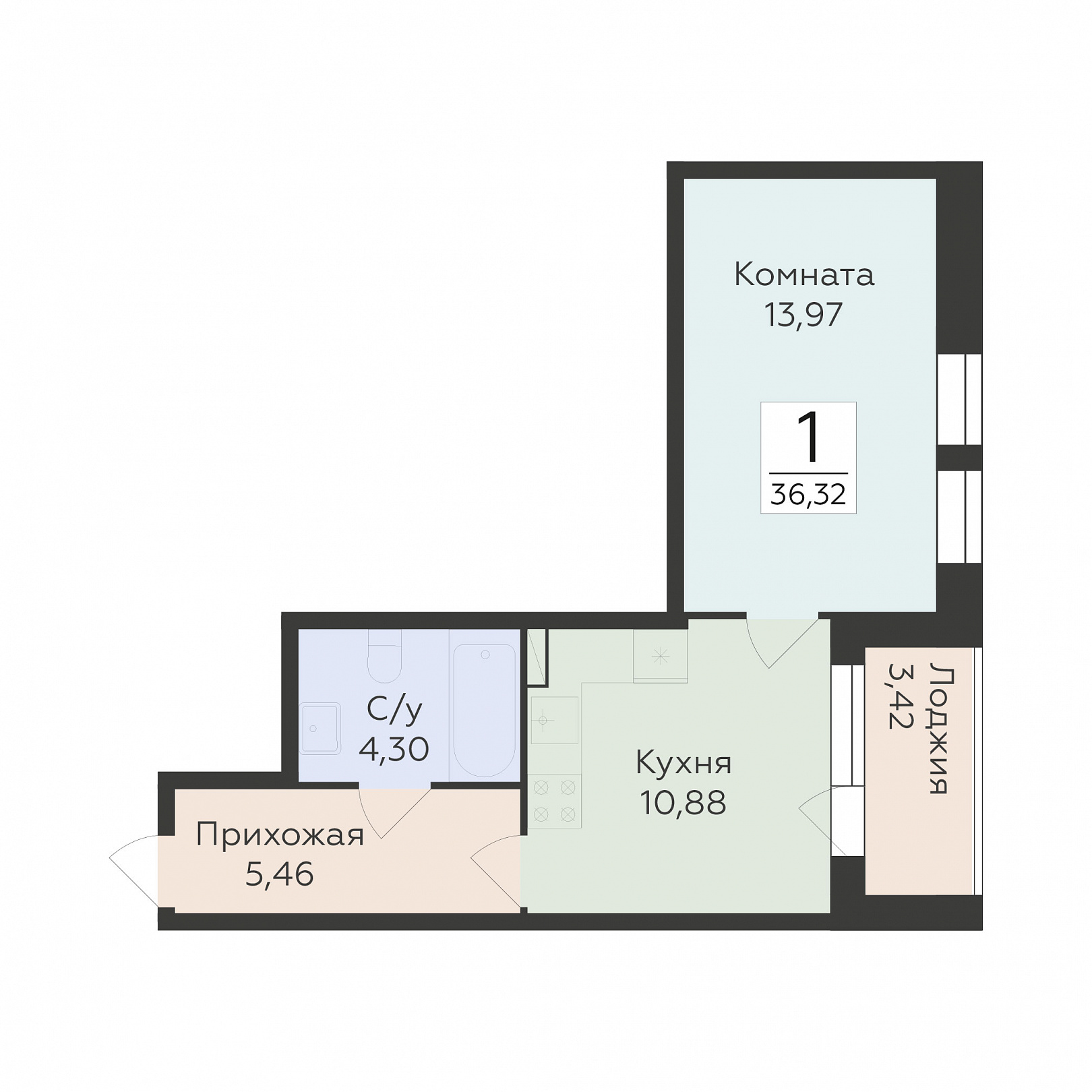 1-комнатная квартира, 36.32 м2, 14 этаж, №1 413, Домино