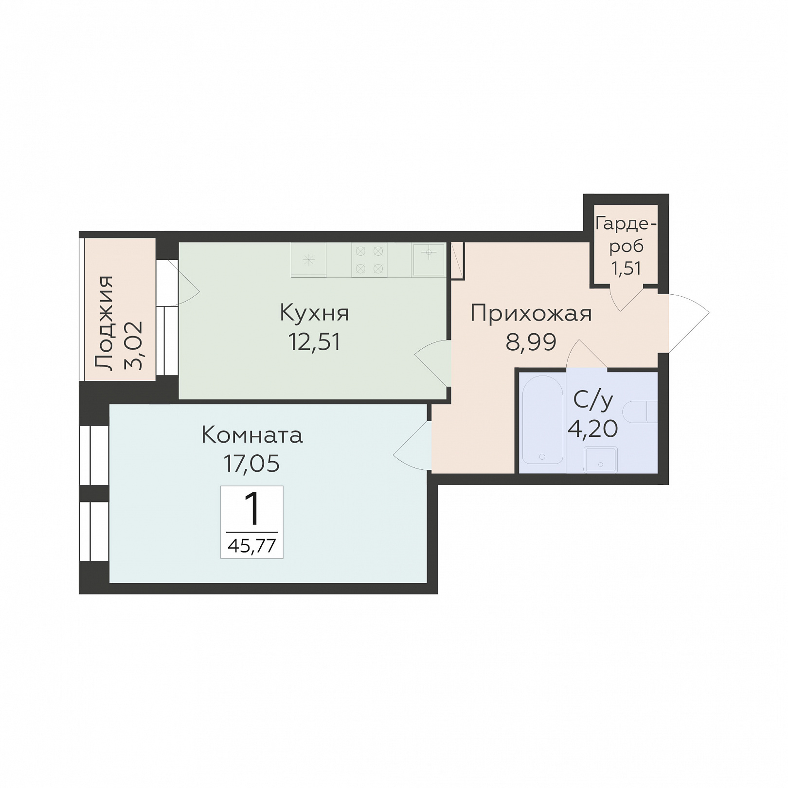 1-комнатная квартира, 45.77 м2, 11 этаж, №1 383, Домино