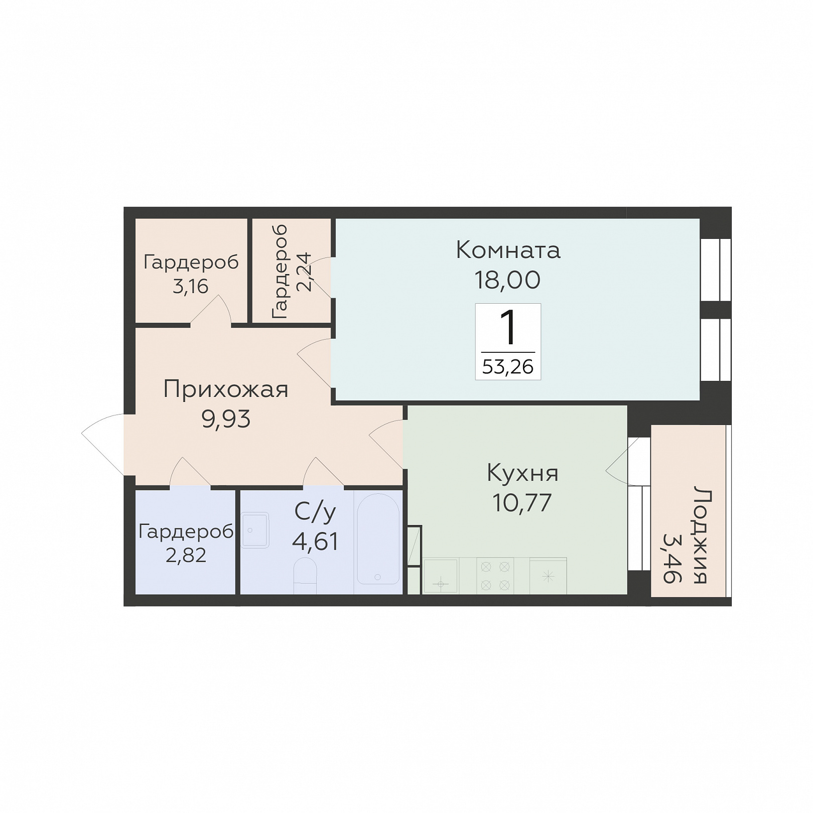 1-комнатная квартира, 53.26 м2, 7 этаж, №1 323, Домино