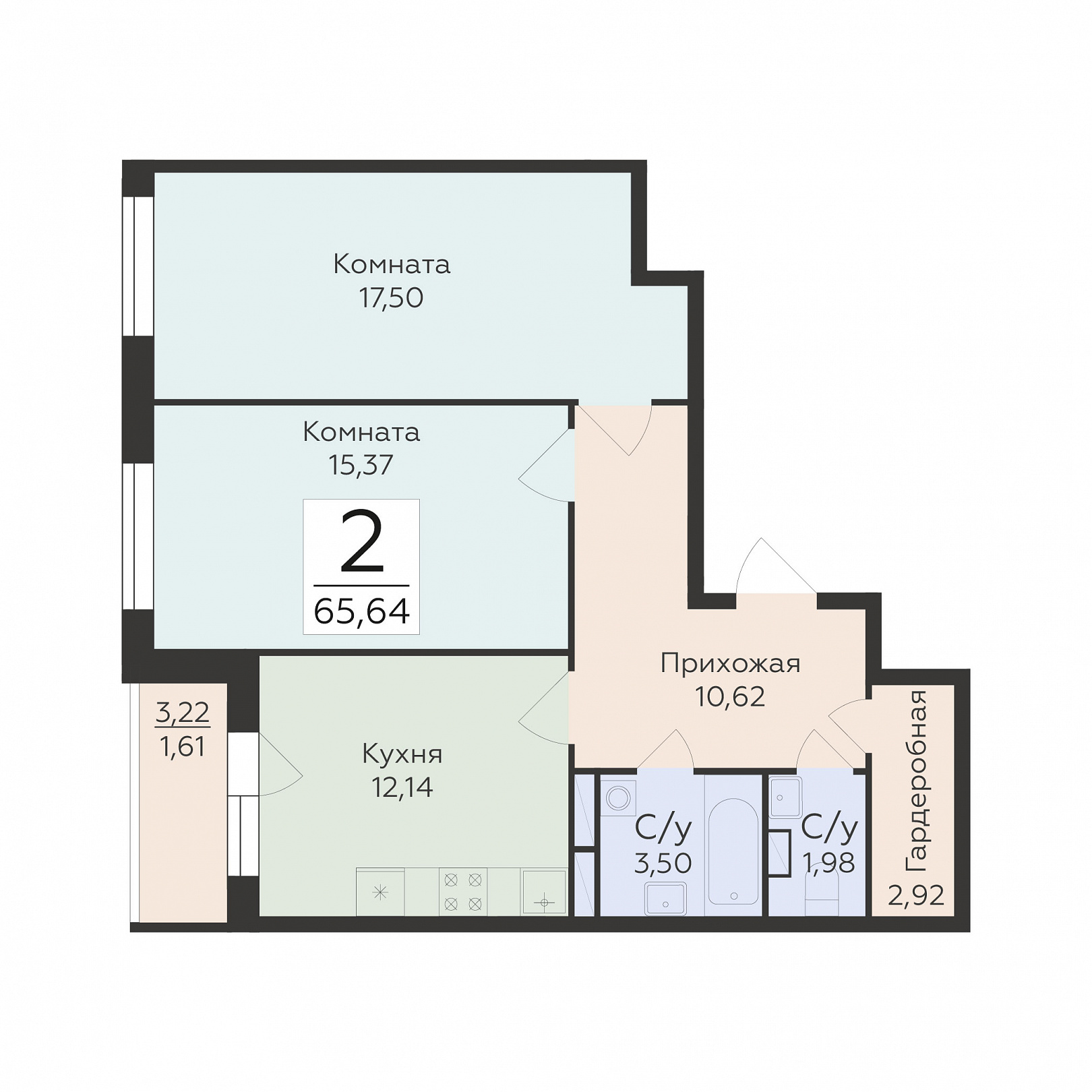 2-комнатная квартира, 65.64 м2, 9 этаж, №983, Домино