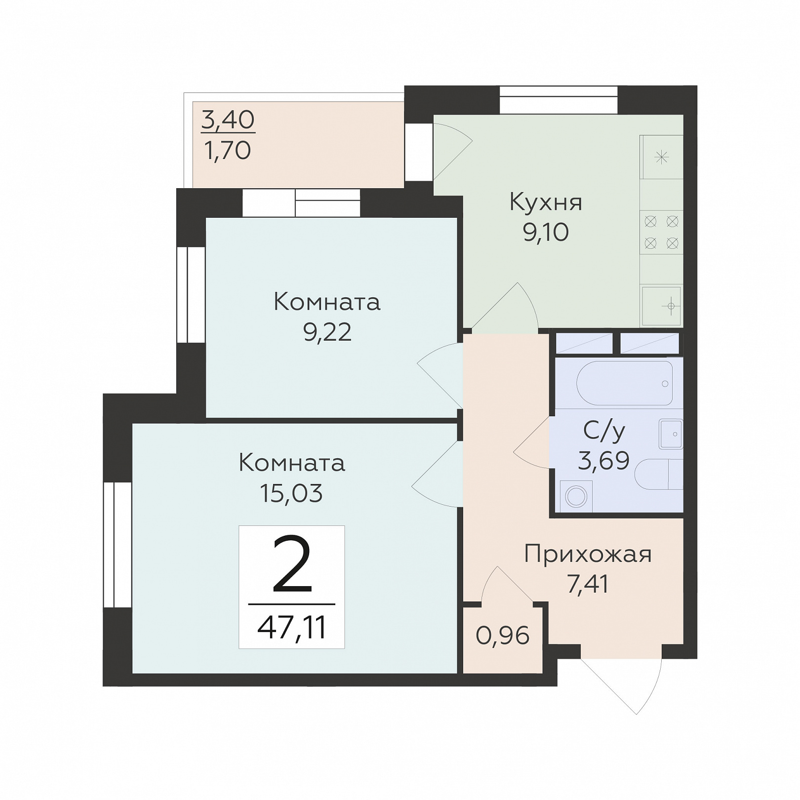 2-комнатная квартира, 47.11 м2, 13 этаж, №1 030, Домино