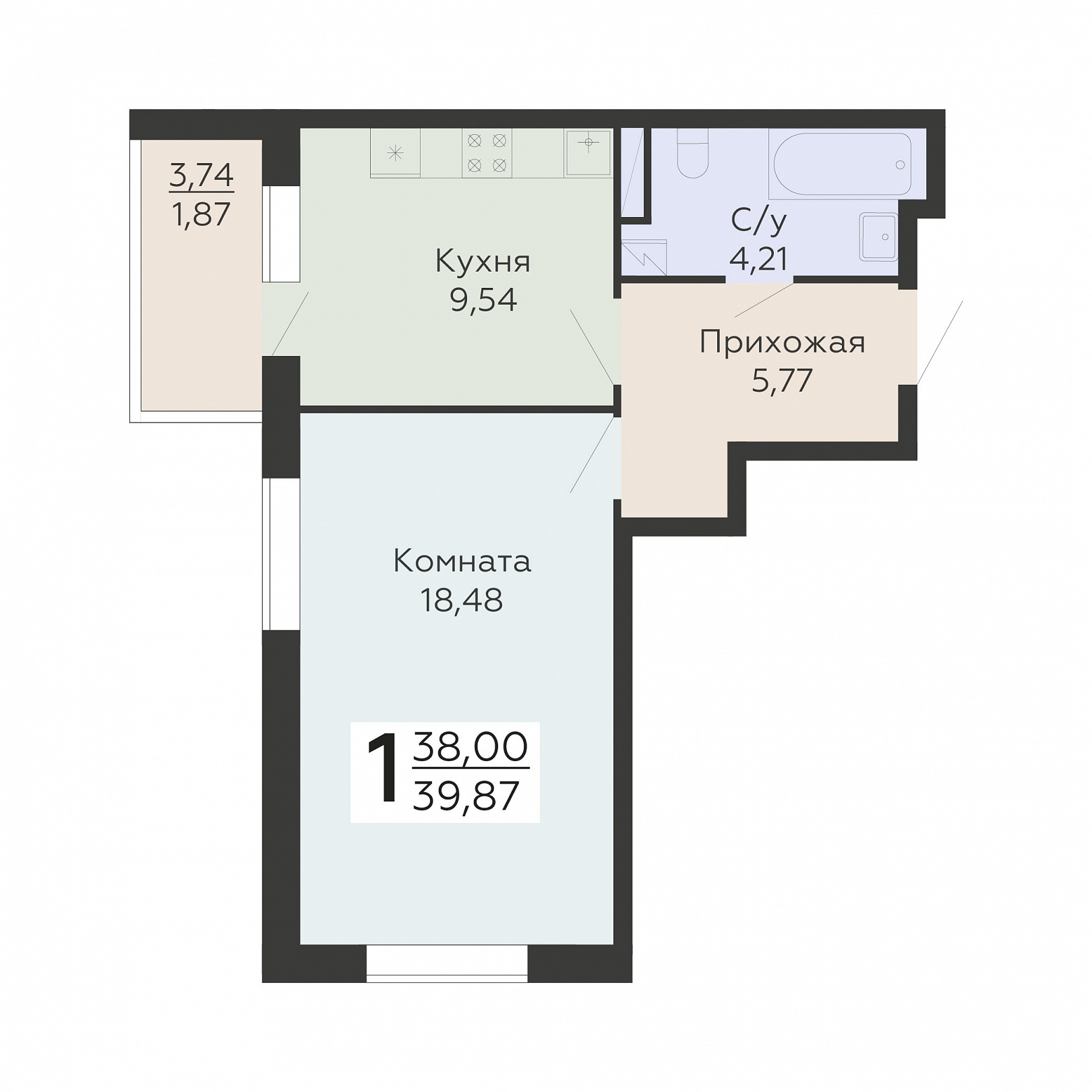 1-комнатная квартира, 39.87 м2, 12 этаж, №992, Никитинские сады
