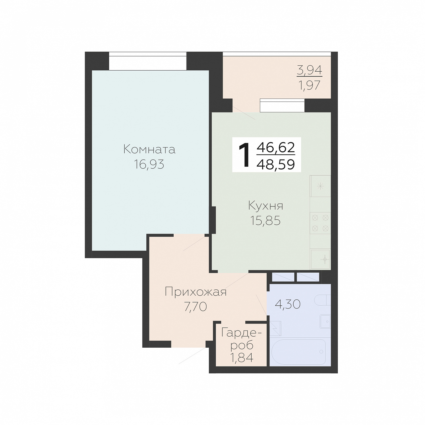 1-комнатная квартира, 48.59 м2, 2 этаж, №764, Зарядье