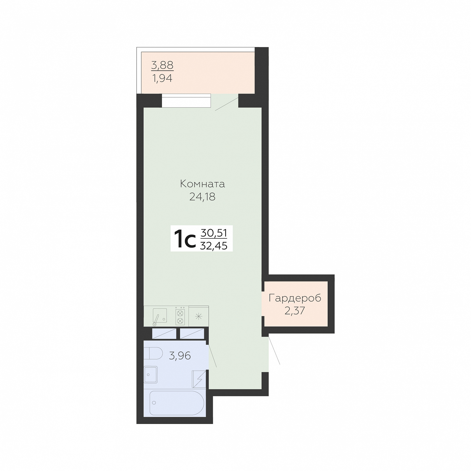 1-комнатная (студия), 32.45 м2, 5 этаж, №1 042, Зарядье