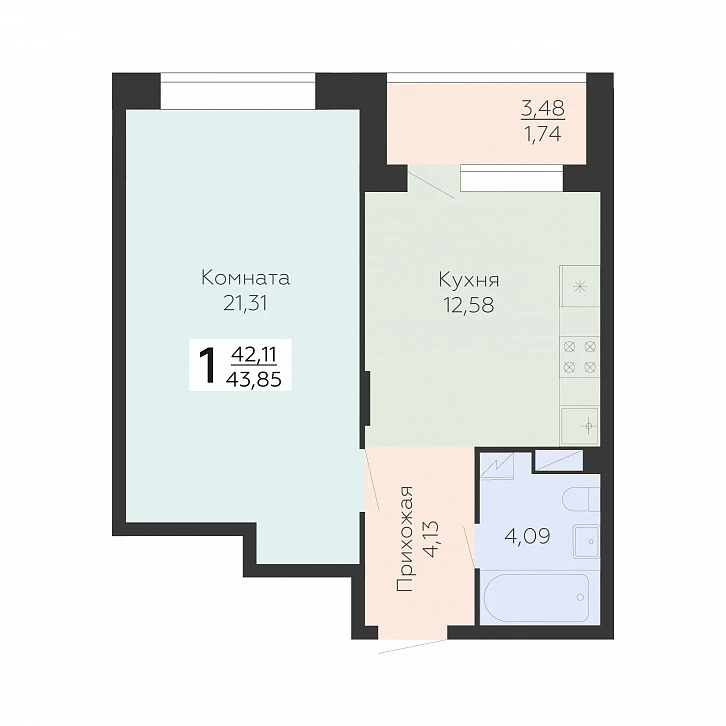 1-комнатная квартира, 43.85 м2, 4 этаж, №1 035, Зарядье