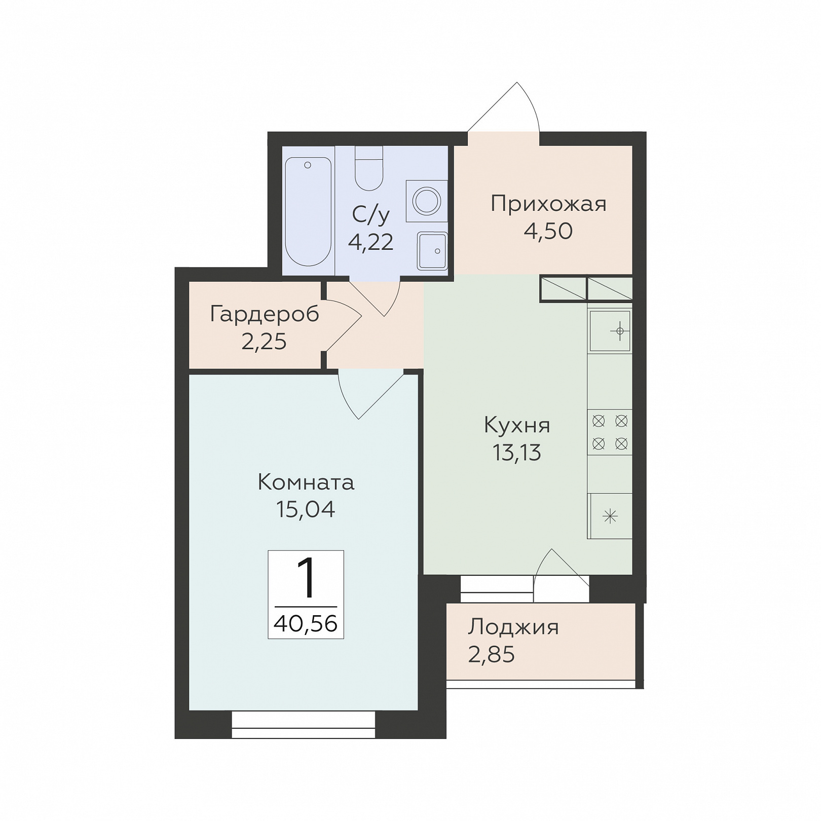 1-комнатная квартира, 40.56 м2, 4 этаж, №69, Романовский