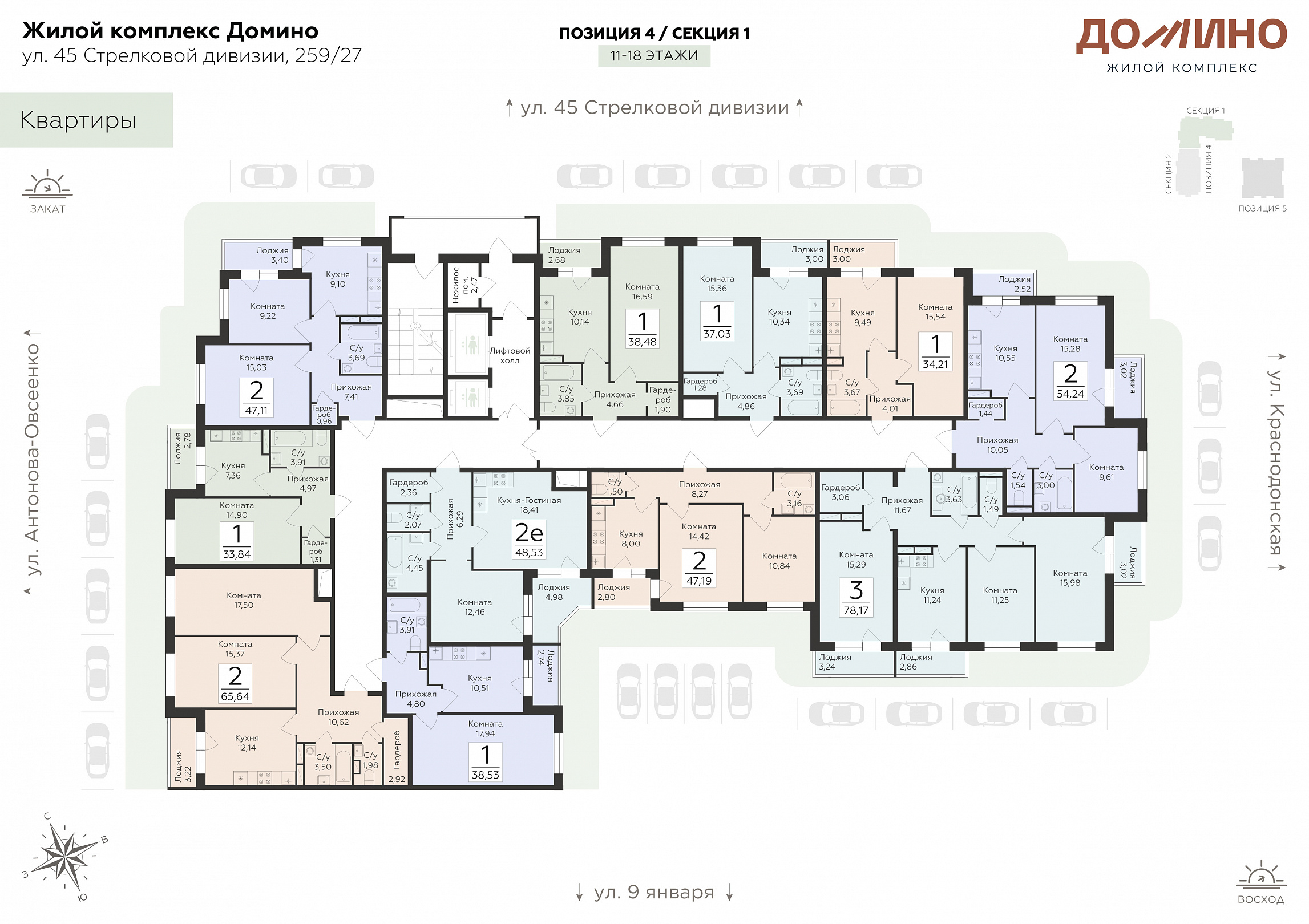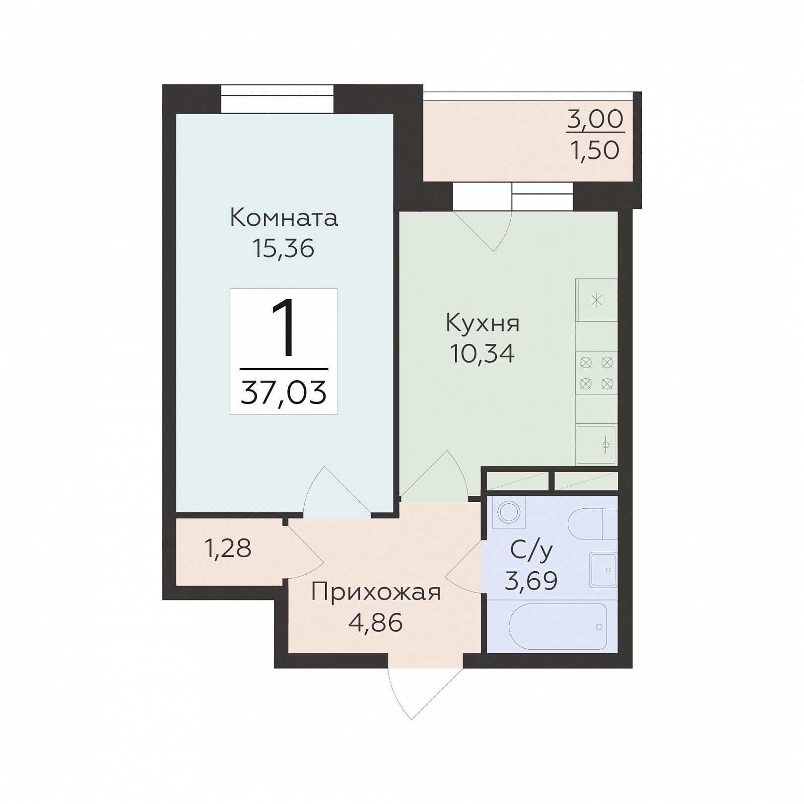 1-комнатная квартира, 37.03 м2, 11 этаж, №999, Домино