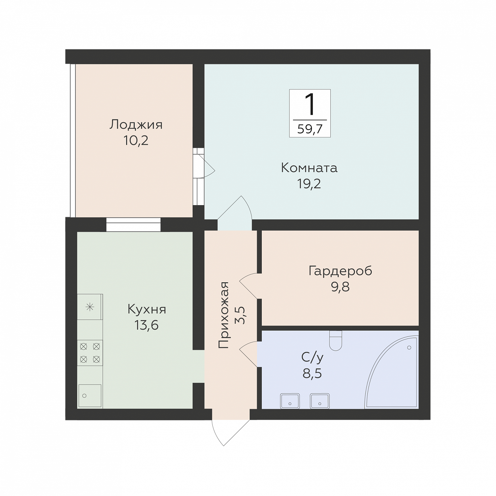 1-комнатная квартира, 59.7 м2, 10 этаж, №87, Классики