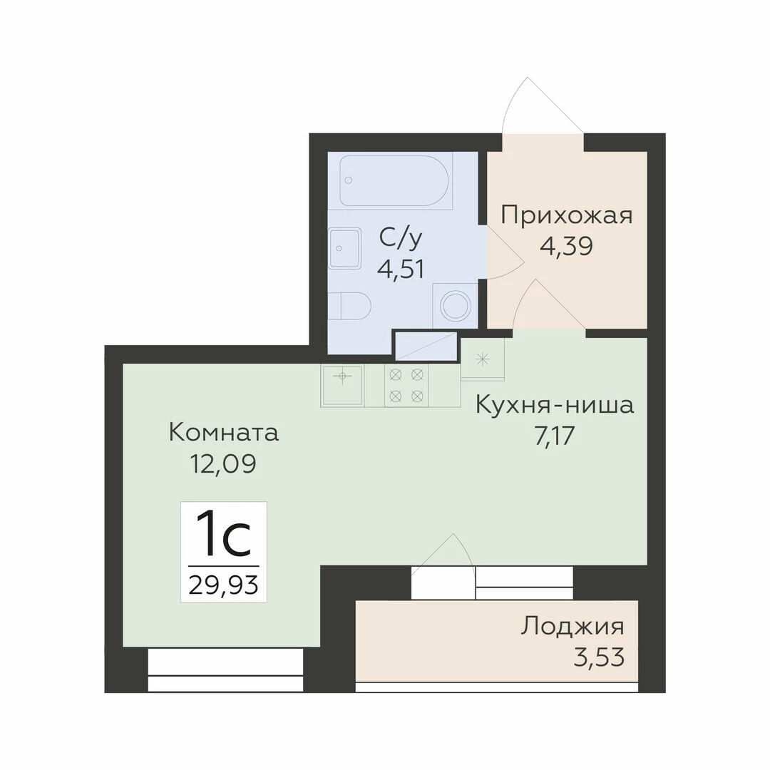 1-комнатная (студия), 29.93 м2, 4 этаж, №273, Октябрьский квартал