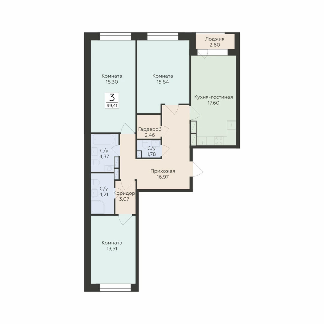 3-комнатная квартира, 99.41 м2, 6 этаж, №452, Октябрьский квартал