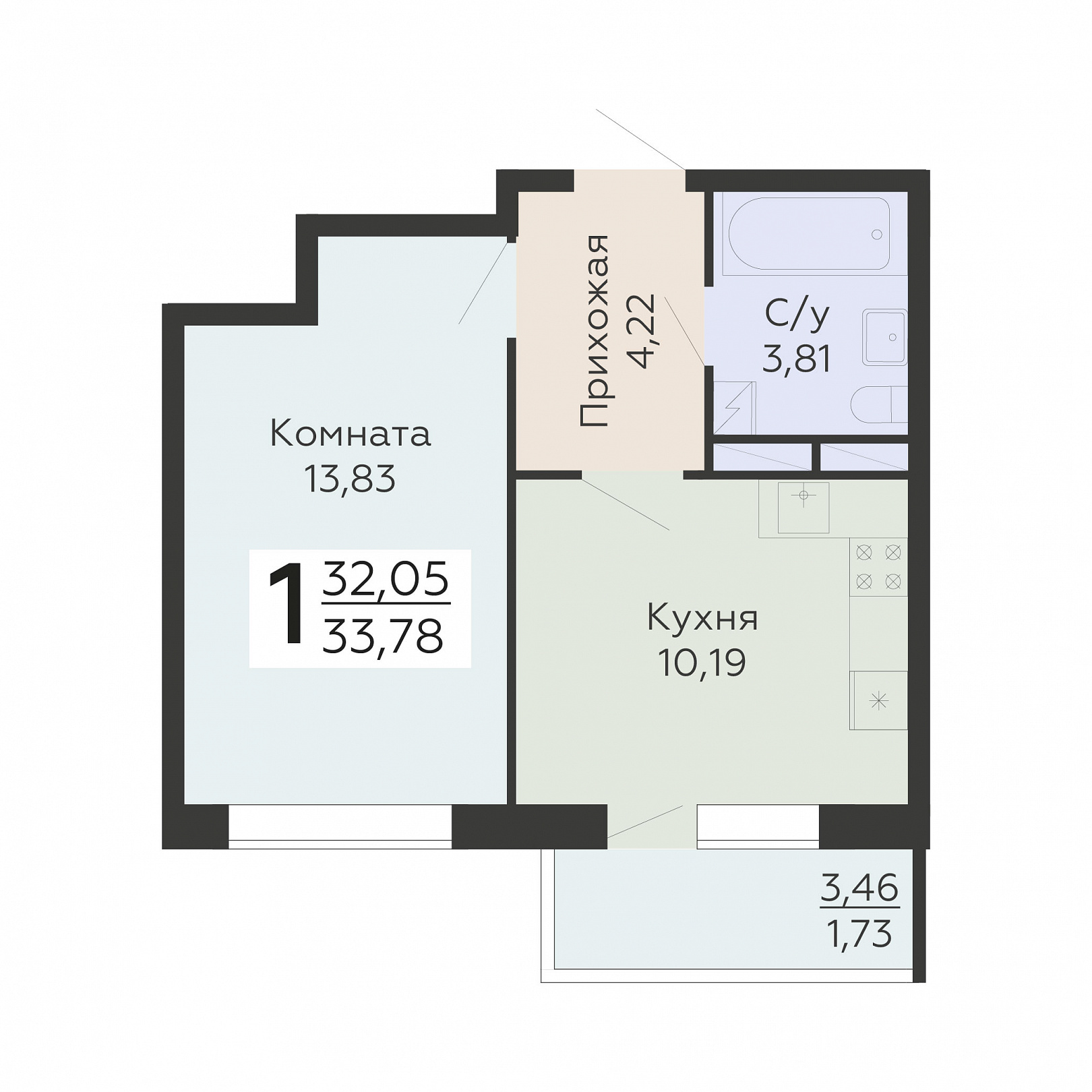 1-комнатная квартира, 33.78 м2, 18 этаж, №1 081, Никитинские сады