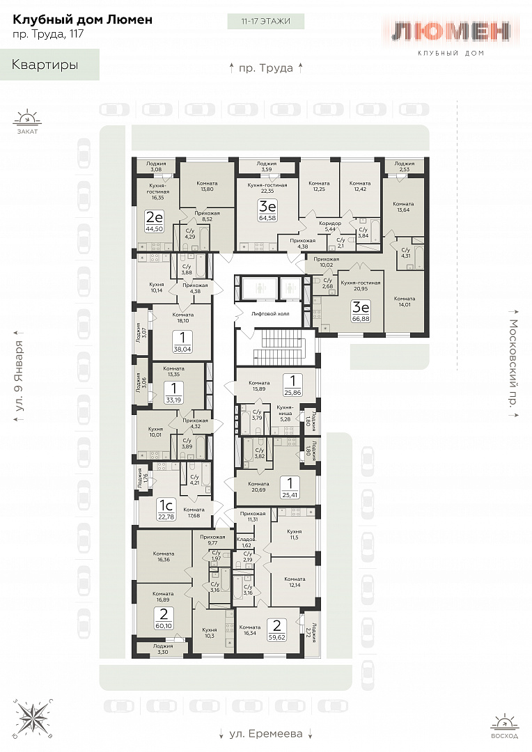 2-комнатная квартира, 59.62 м2, 11 этаж, №93, Люмен