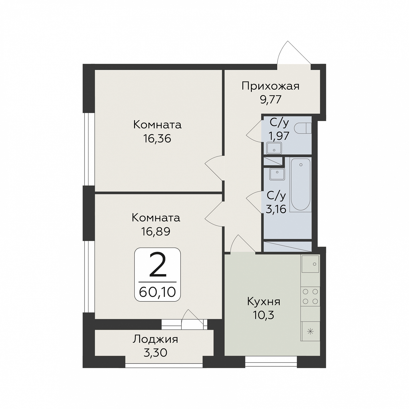 2-комнатная квартира, 60.1 м2, 11 этаж, №94, Люмен