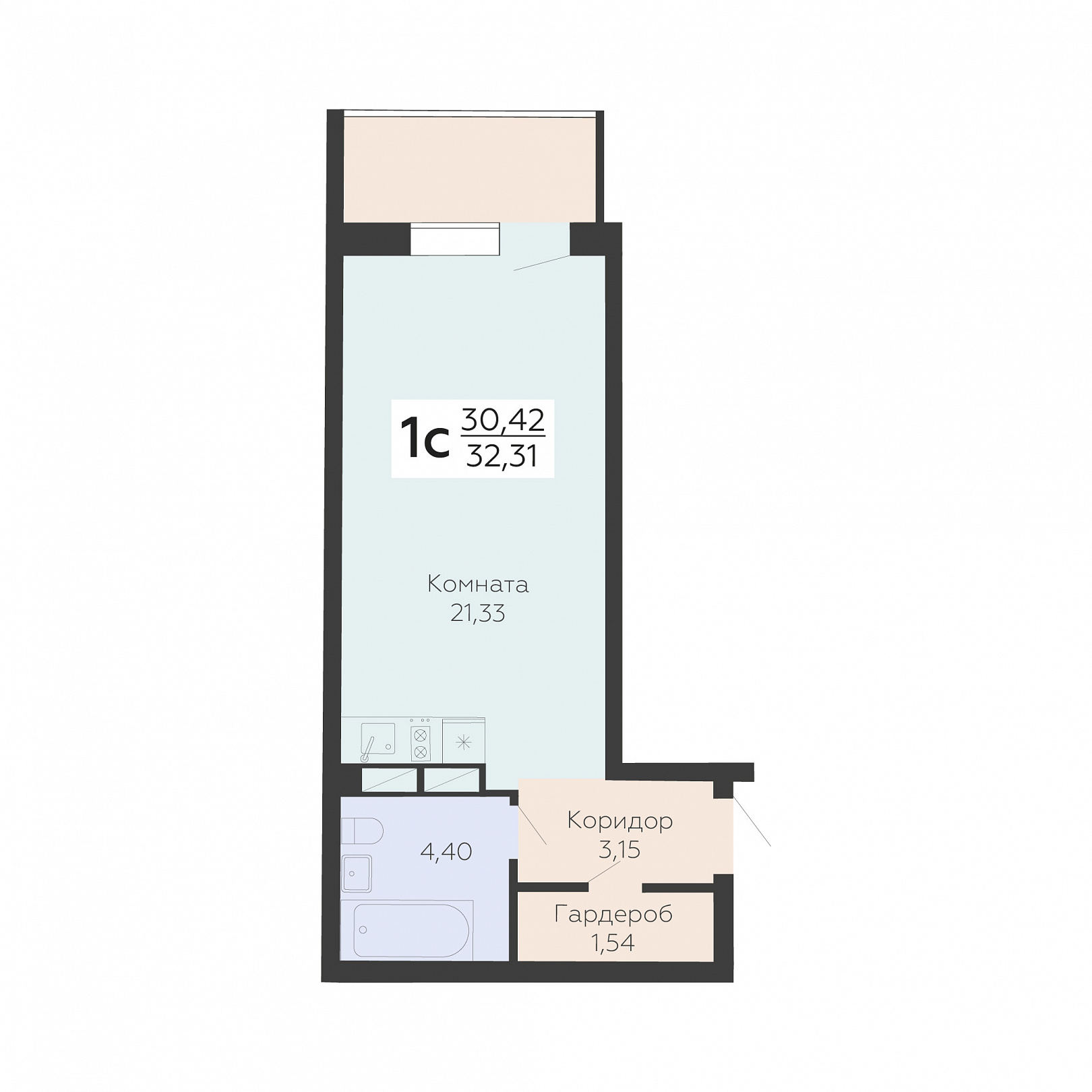 1-комнатная (студия), 32.31 м2, 9 этаж, №472, Зарядье