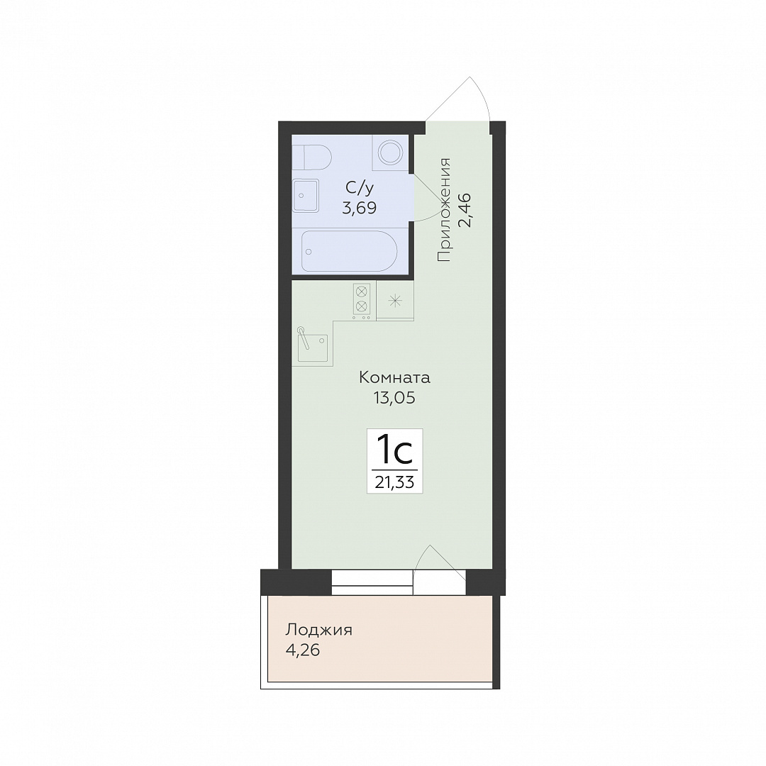 1-комнатная (студия), 21.33 м2, 2 этаж, №330, Flora