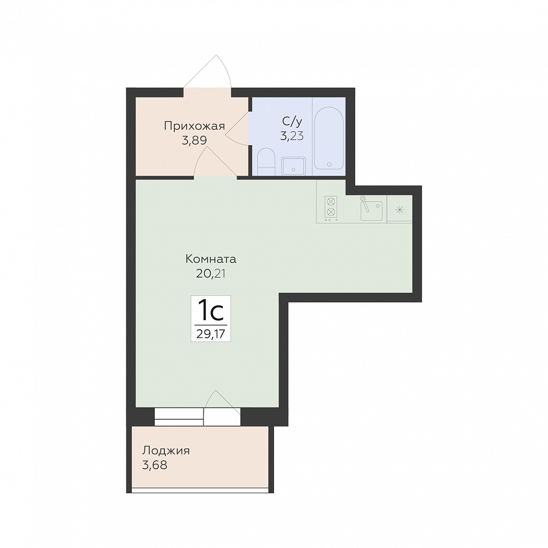 1-комнатная (студия), 29.17 м2, 11 этаж, №374, Flora