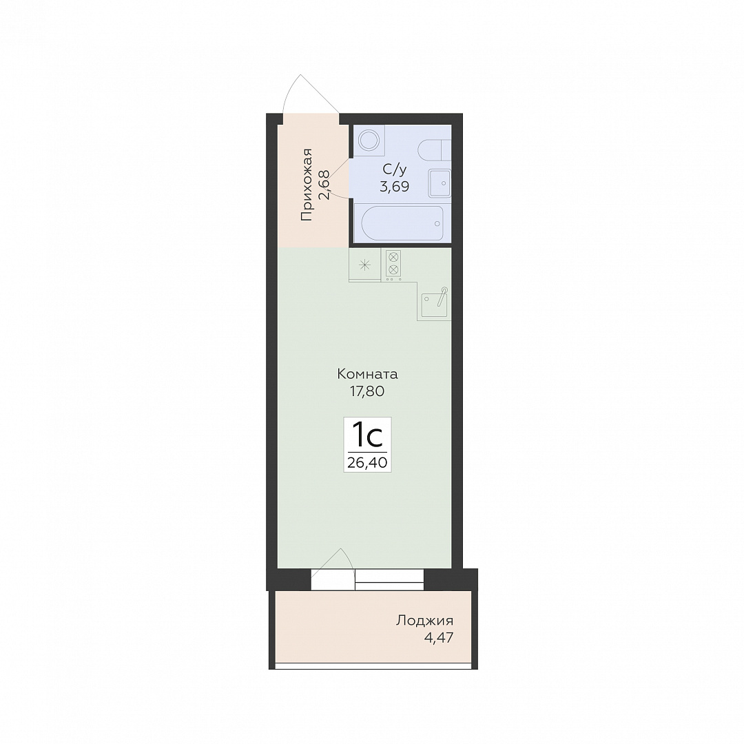 1-комнатная (студия), 26.4 м2, 2 этаж, №489, Flora