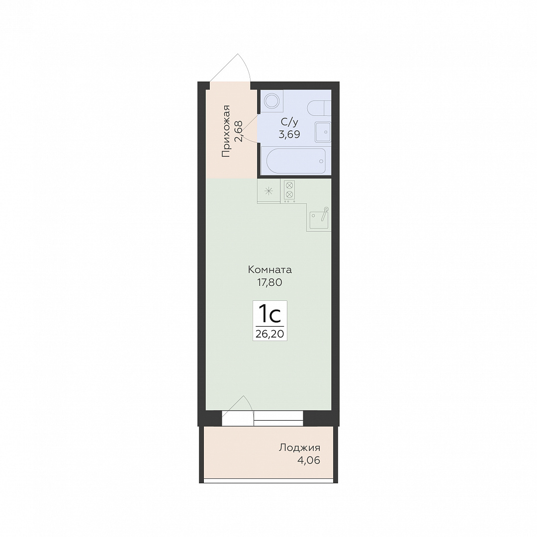 1-комнатная (студия), 26.2 м2, 2 этаж, №491, Flora