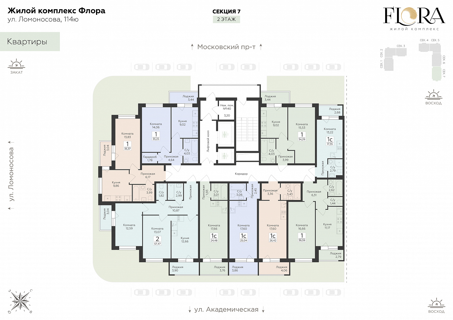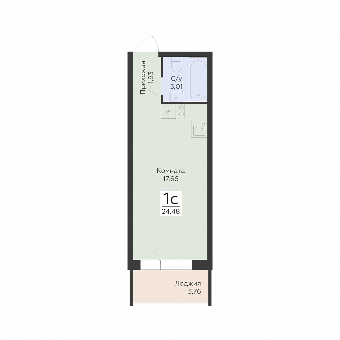 1-комнатная (студия), 24.48 м2, 2 этаж, №627, Flora