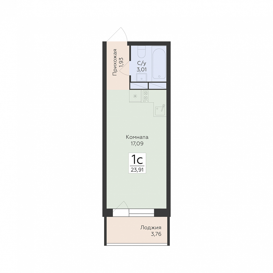 1-комнатная (студия), 23.91 м2, 3 этаж, №636, Flora