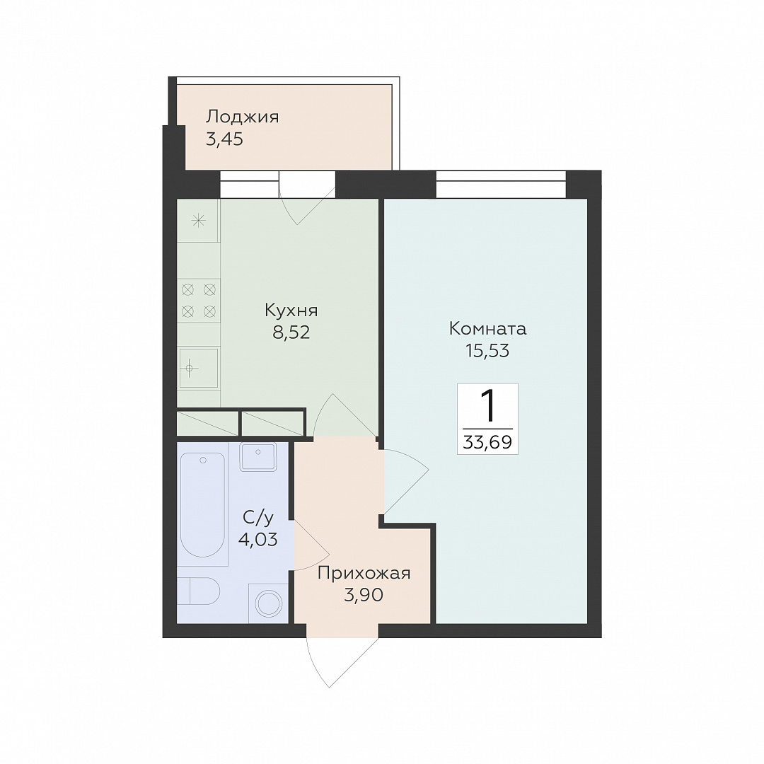 1-комнатная квартира, 33.69 м2, 13 этаж, №717, Flora