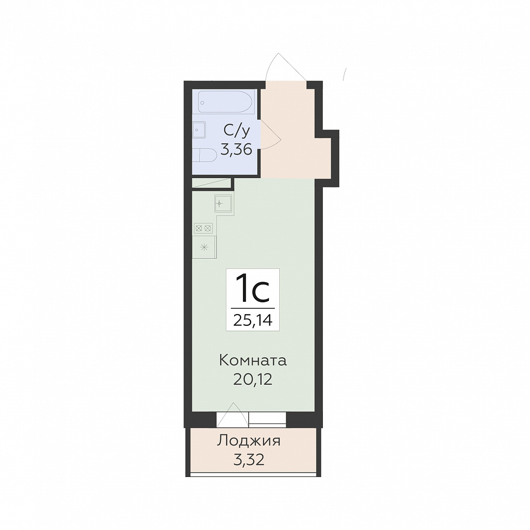 1-комнатная (студия), 25.14 м2, 9 этаж, №295, Авиапарк