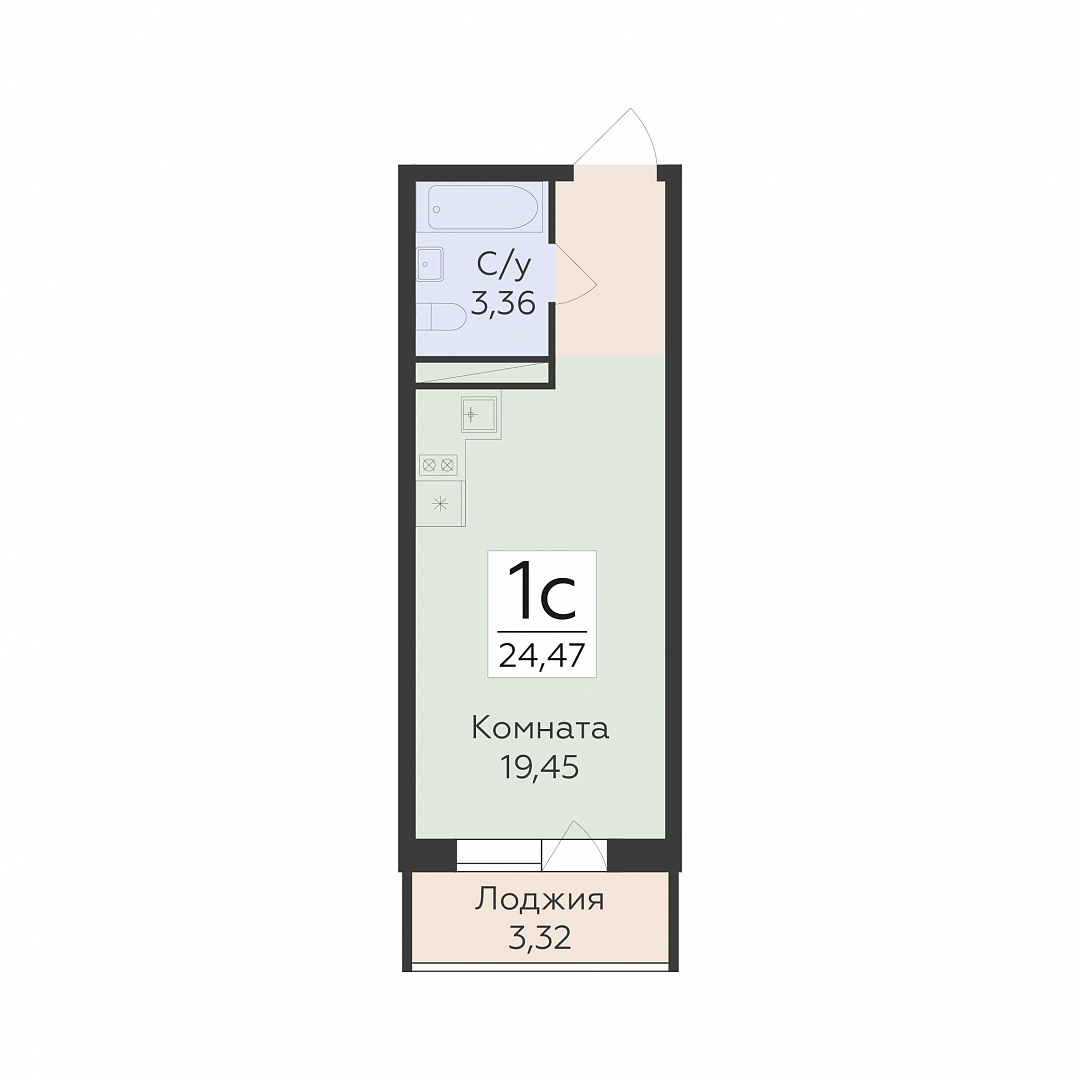 1-комнатная (студия), 24.47 м2, 9 этаж, №297, Авиапарк