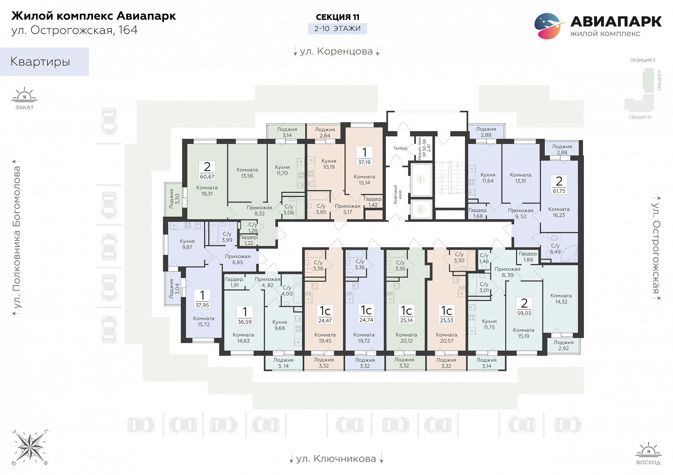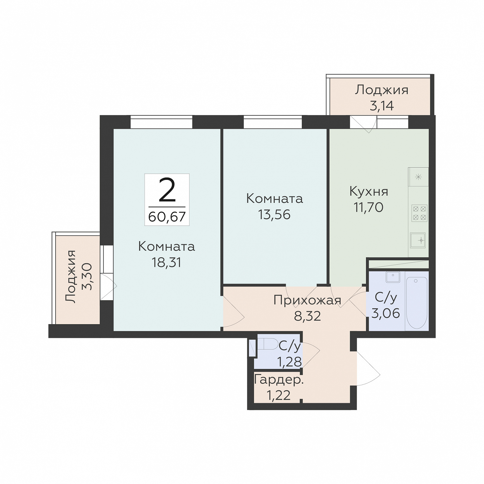 2-комнатная квартира, 60.67 м2, 10 этаж, №310, Авиапарк