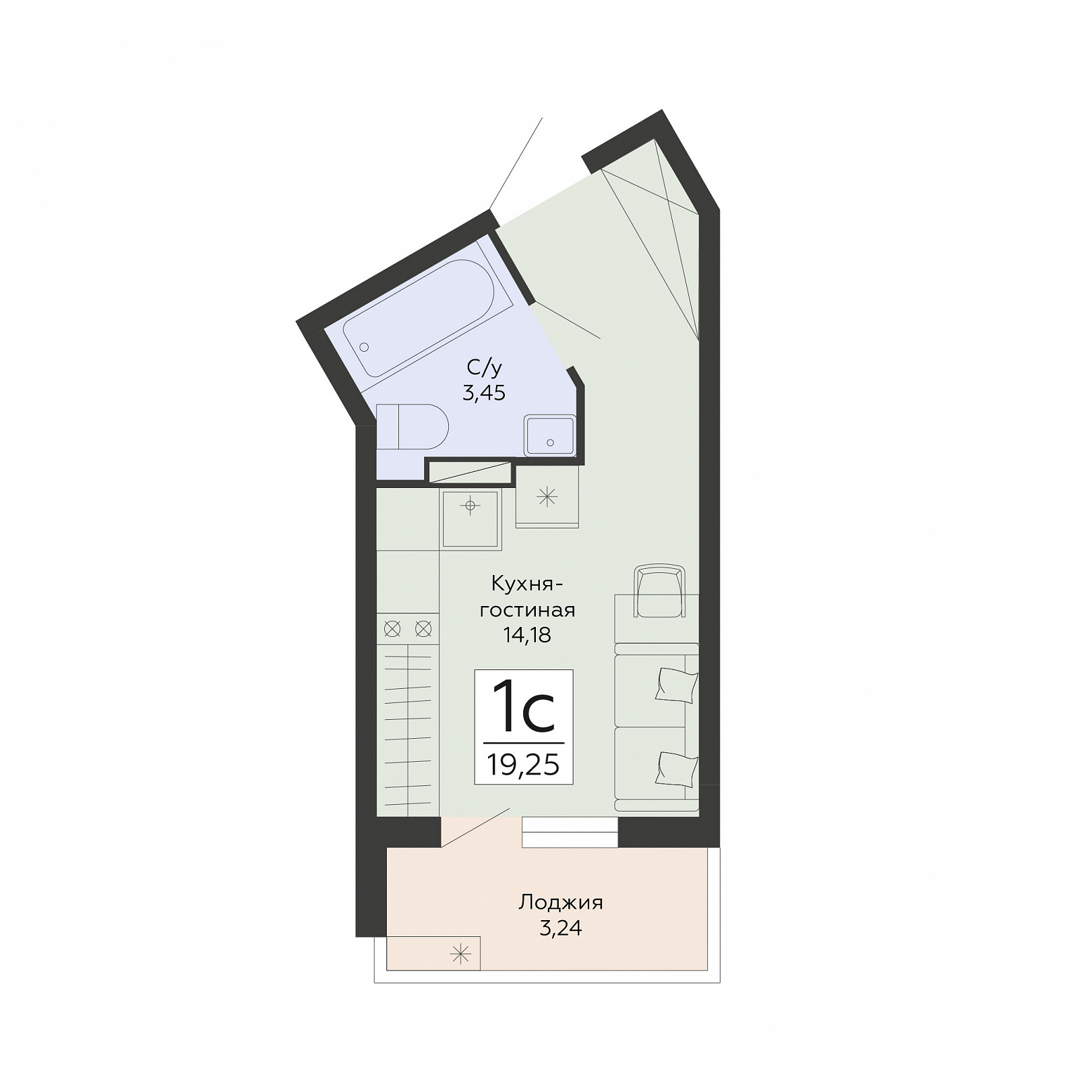 1-комнатная (студия), 19.25 м2, 9 этаж, №99, Мармелад