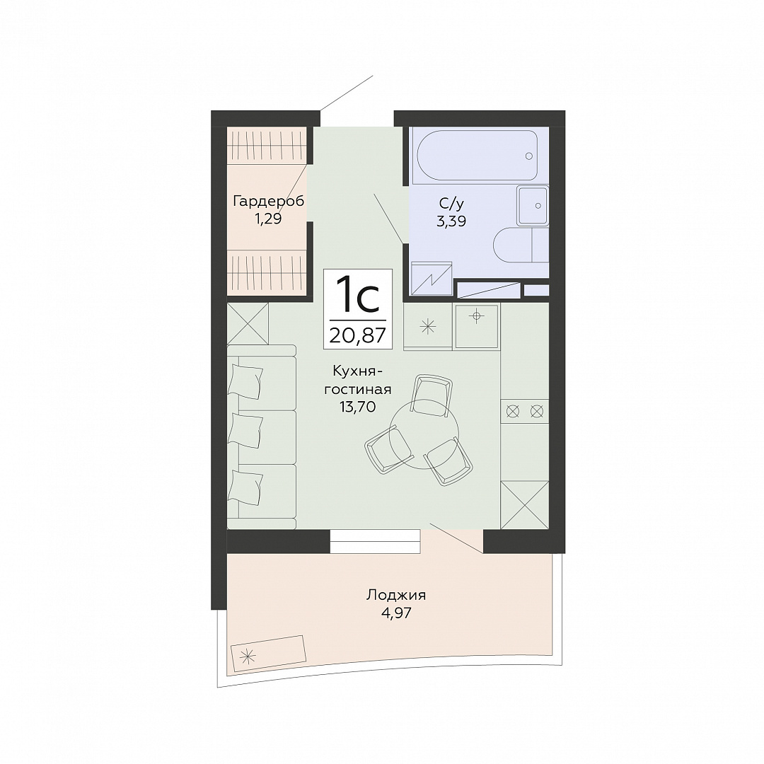 1-комнатная (студия), 20.87 м2, 8 этаж, №82, Мармелад