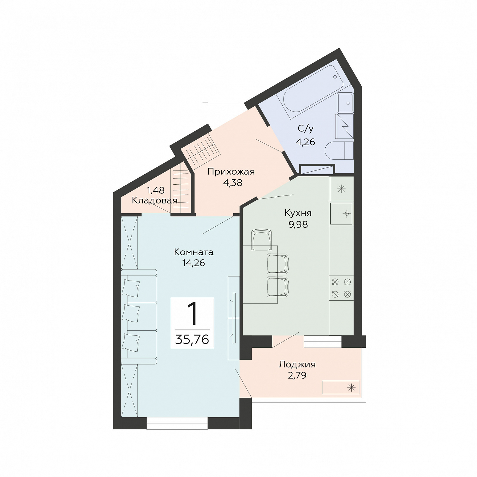 1-комнатная квартира, 35.76 м2, 8 этаж, №228, Мармелад