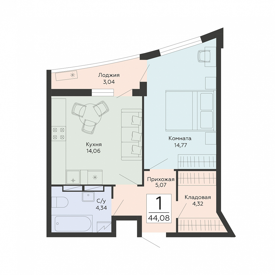 1-комнатная квартира, 44.08 м2, 2 этаж, №157, Мармелад
