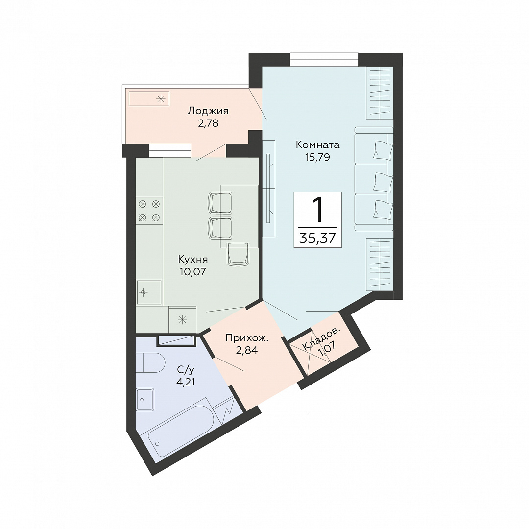 1-комнатная квартира, 35.37 м2, 9 этаж, №383, Мармелад