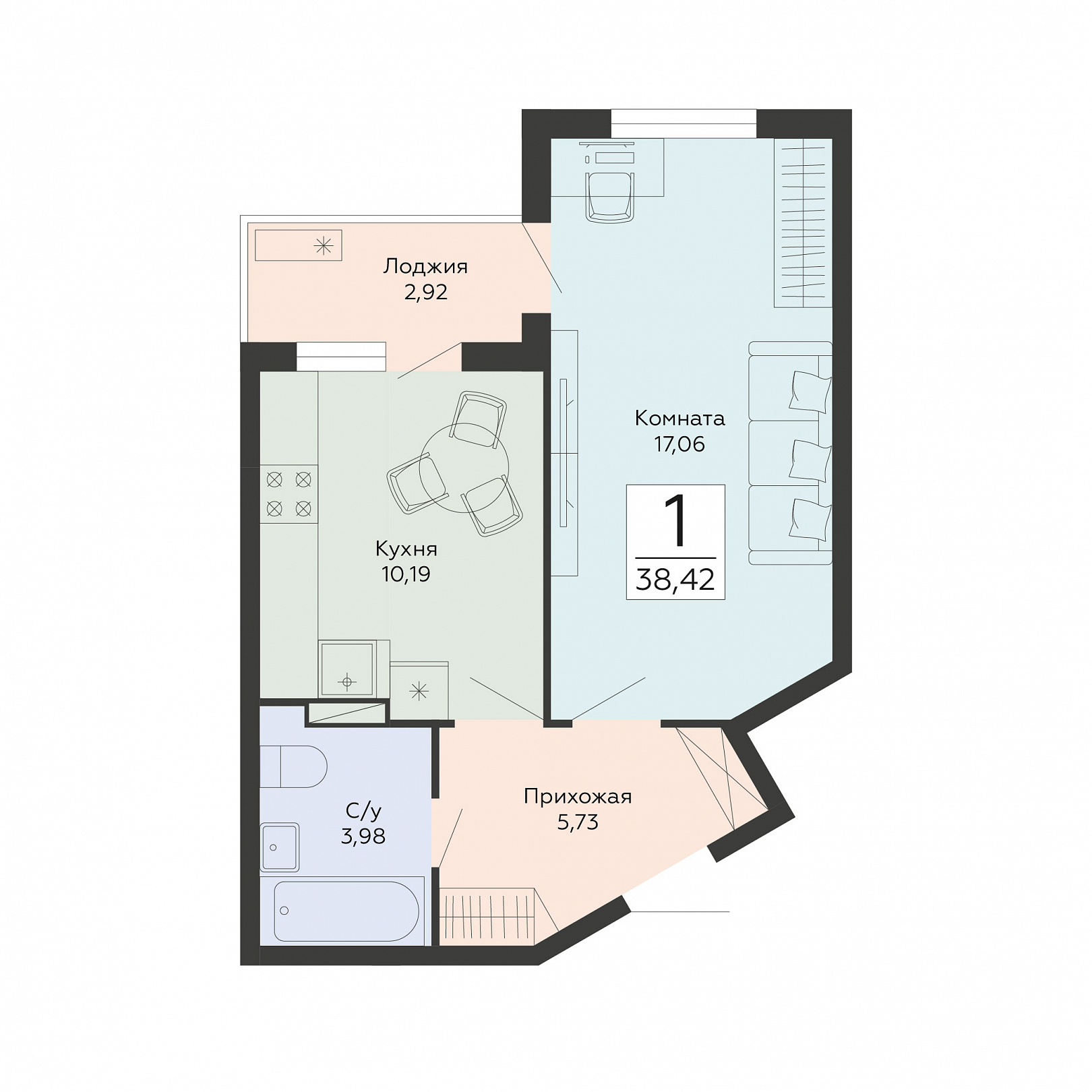 1-комнатная квартира, 38.42 м2, 9 этаж, №382, Мармелад