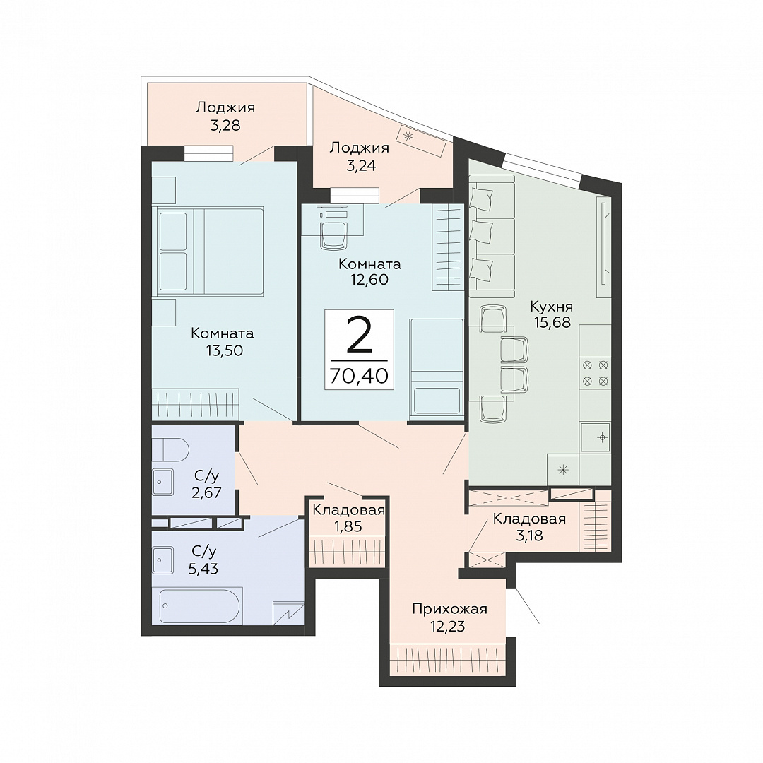 2-комнатная квартира, 70.4 м2, 8 этаж, №233, Мармелад