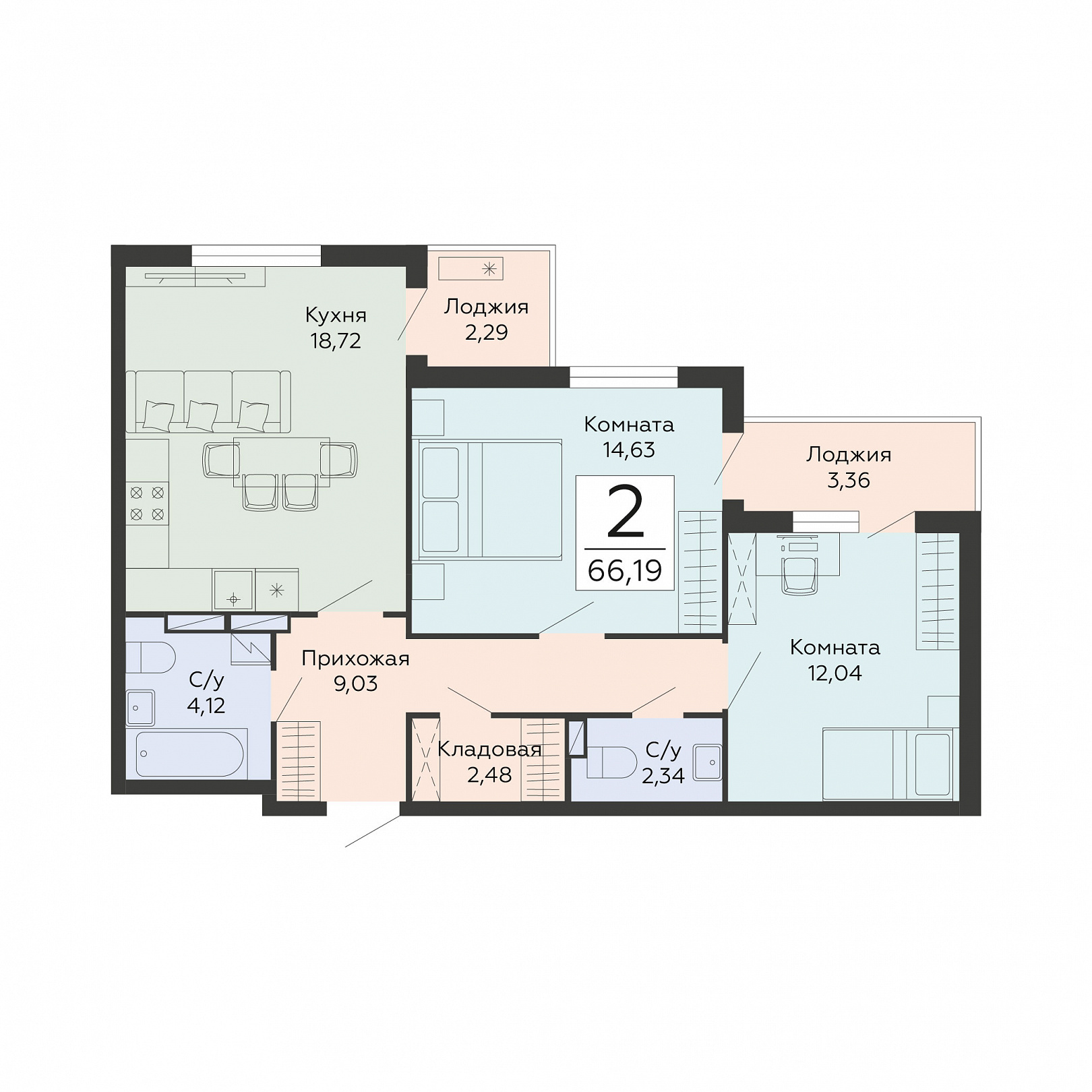 2-комнатная квартира, 66.19 м2, 9 этаж, №373, Мармелад
