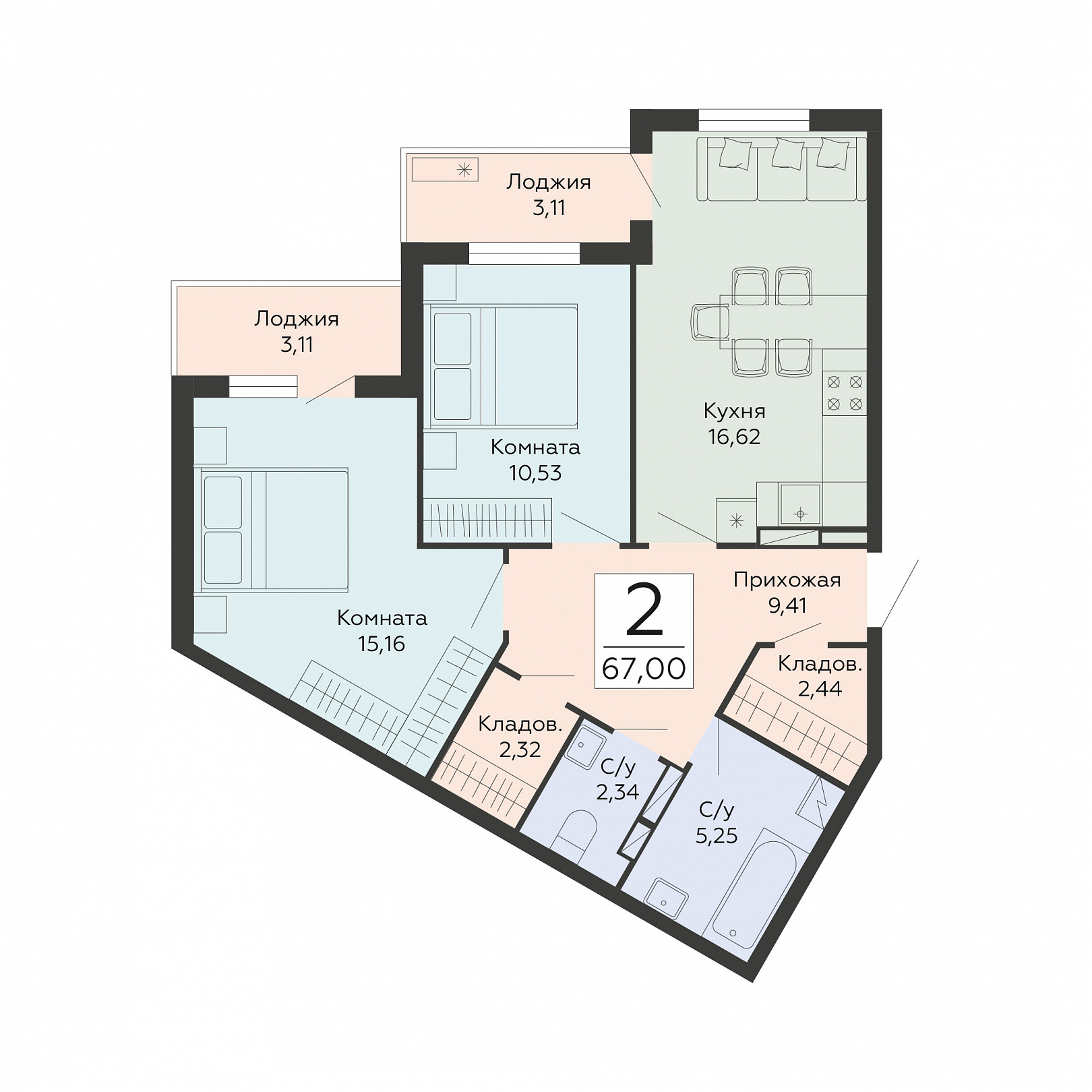 2-комнатная квартира, 67 м2, 6 этаж, №345, Мармелад