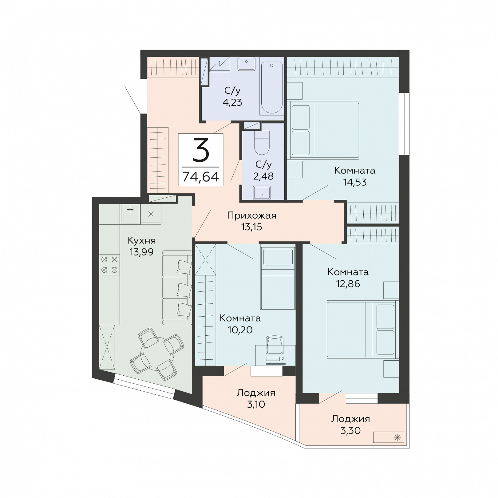 3-комнатная квартира, 74.64 м2, 8 этаж, №362, Мармелад