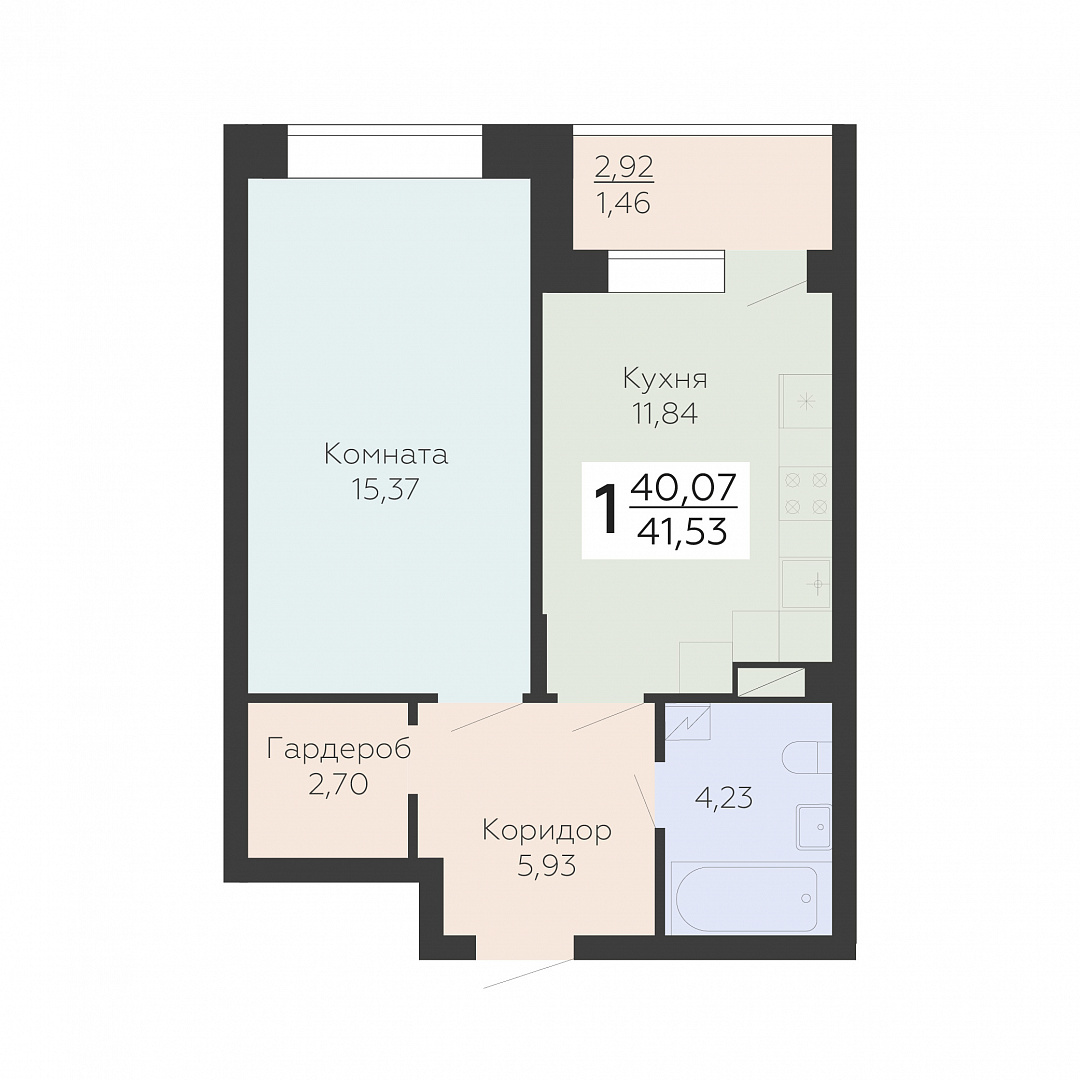 1-комнатная квартира, 41.53 м2, 13 этаж, №513/1, Зарядье